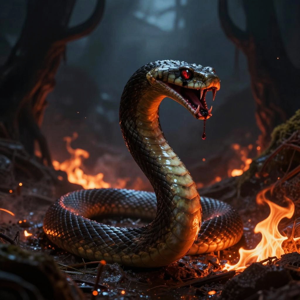Demonic snake slithering through a fiery underworld, glowing venom dripping from its fangs, dark shadows and eerie lighting, supernatural horror vibe