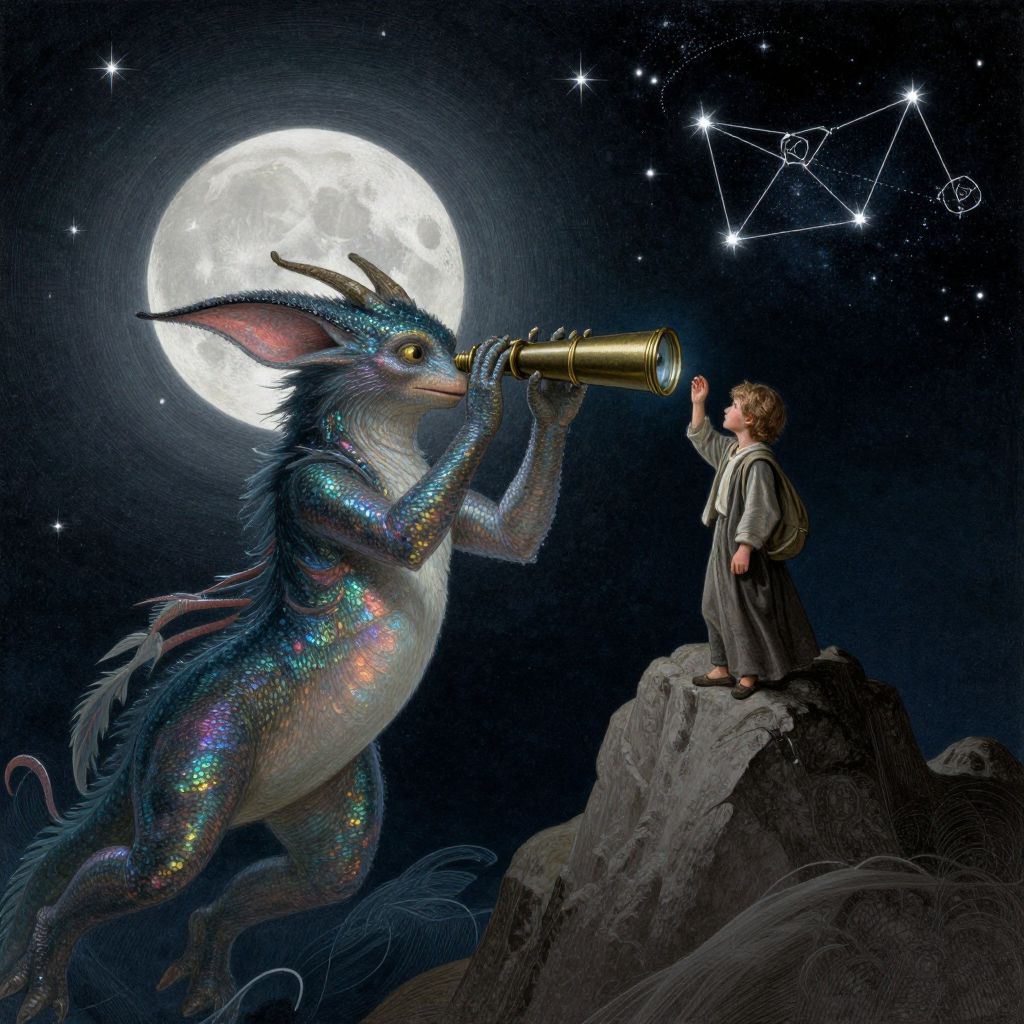 Digital artwork depicting a fantastical scene under a full moon. A large, blue, iridescent dragon with rainbow-like scales and antler-like horns kneels on a rocky outcrop, using a golden telescope to look at a young boy standing on an adjacent rock. The boy, dressed in a gray robe, gazes upward at a constellation in a starry night sky. The dragon's textured scales contrast with the smooth, dark rocks and the luminous, glowing moon in the background. The constellation is outlined in white, adding a mystical element to the scene. The overall style is vibrant and imaginative, blending realism with fantasy.