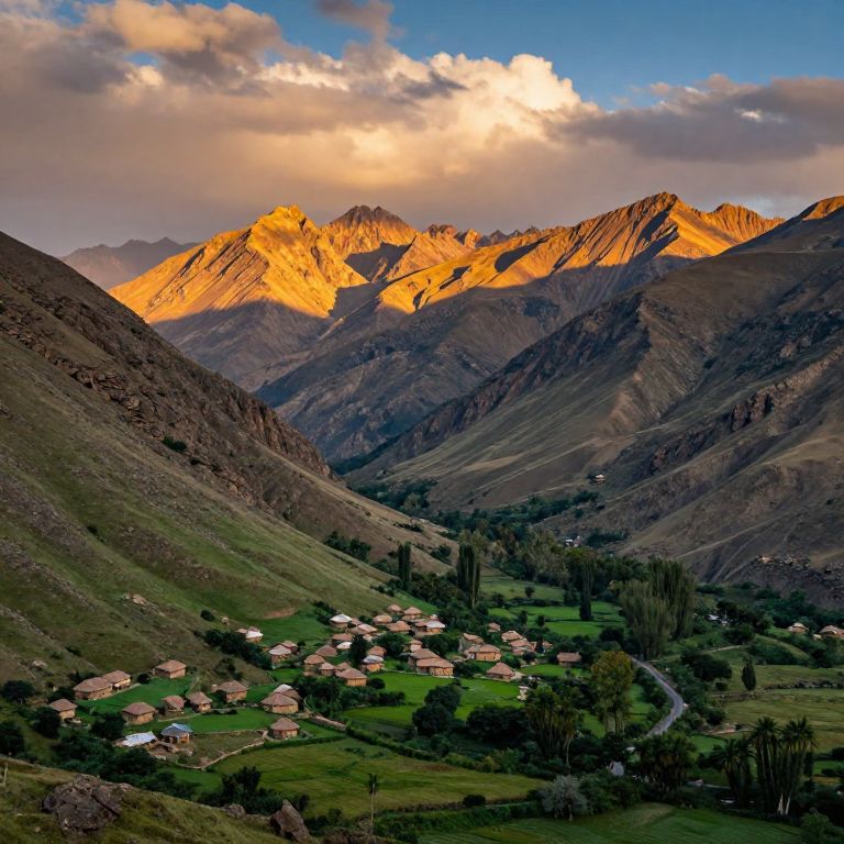 Photograph of a mountainous landscape at sunset. The sun casts a golden glow on the jagged peaks of the mountains in the background, contrasting with the darker, shadowed slopes. In the foreground, a small village with numerous red-roofed houses is nestled in a green valley. The village is surrounded by patches of greenery and scattered trees. A winding road snakes through the valley, leading towards the village. The sky above is partly cloudy, with bright, orange and pink hues from the setting sun. The overall scene is vibrant and picturesque.