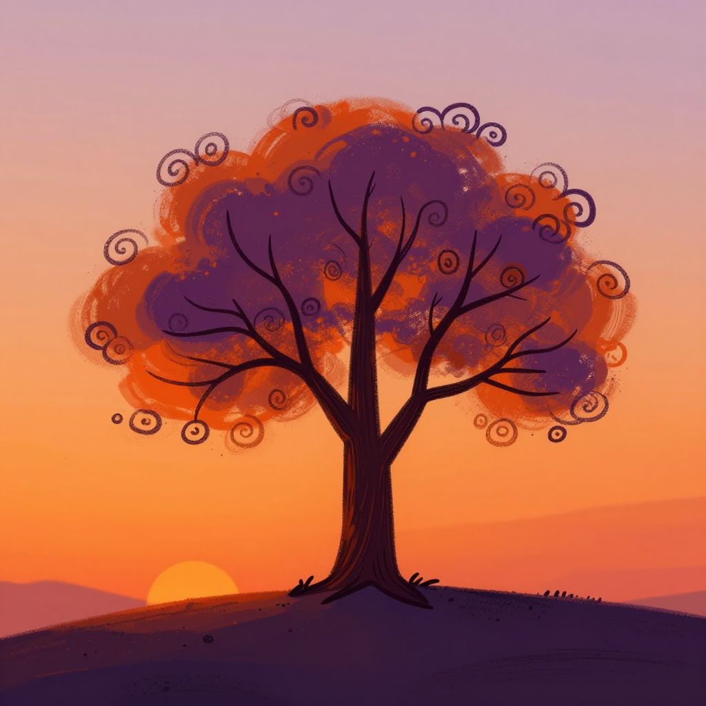 Cartoon tree drawing of a solitary tree on a small hill at sunset, with stylized swirly leaves and gently bending branches, using bright oranges and purples, a mix of minimalistic and expressive brushwork, evoking a peaceful mood