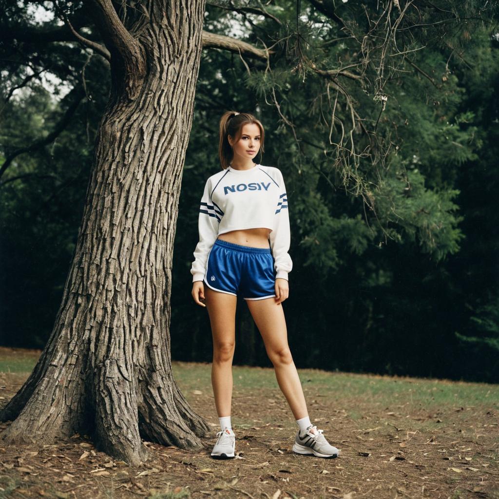 A young woman with brown hair in a ponytail wearing a white cropped sweatshirt with blue stripes, blue athletic shorts, white socks, and gray sneakers. She is standing outdoors next to a large tree trunk in a natural park setting, with green foliage in the background.
