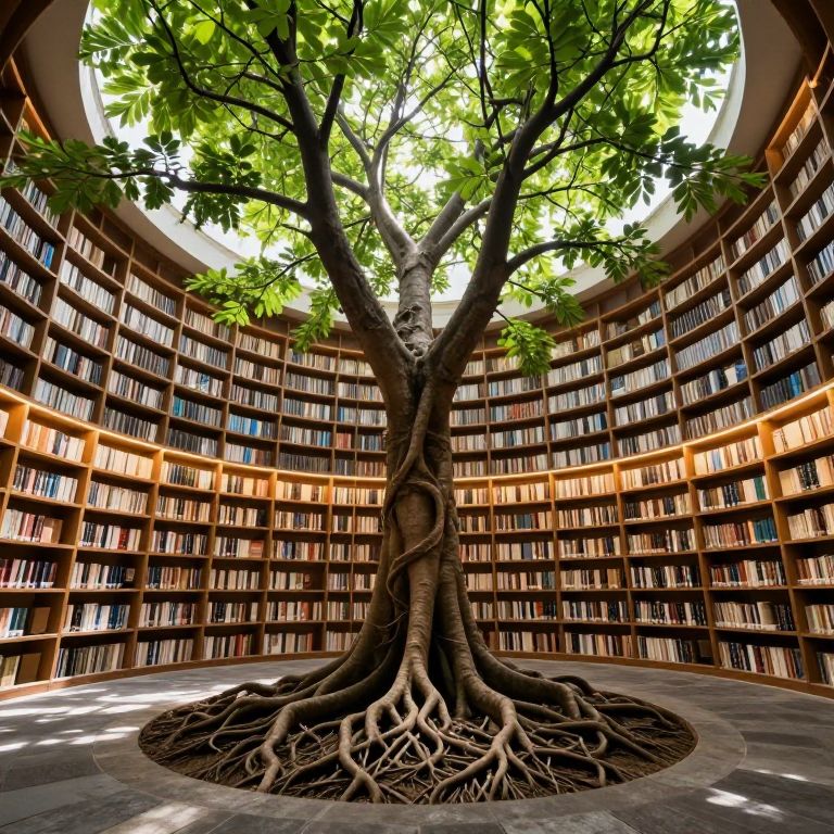 A majestic tree stands inverted within a circular library, its sprawling roots embedded in the stone floor while its branches and vibrant green foliage extend upward through the ceiling, casting dappled light onto the warmly lit bookshelves that encircle the space.