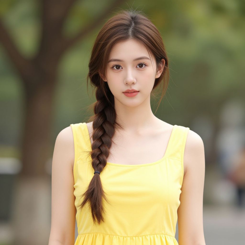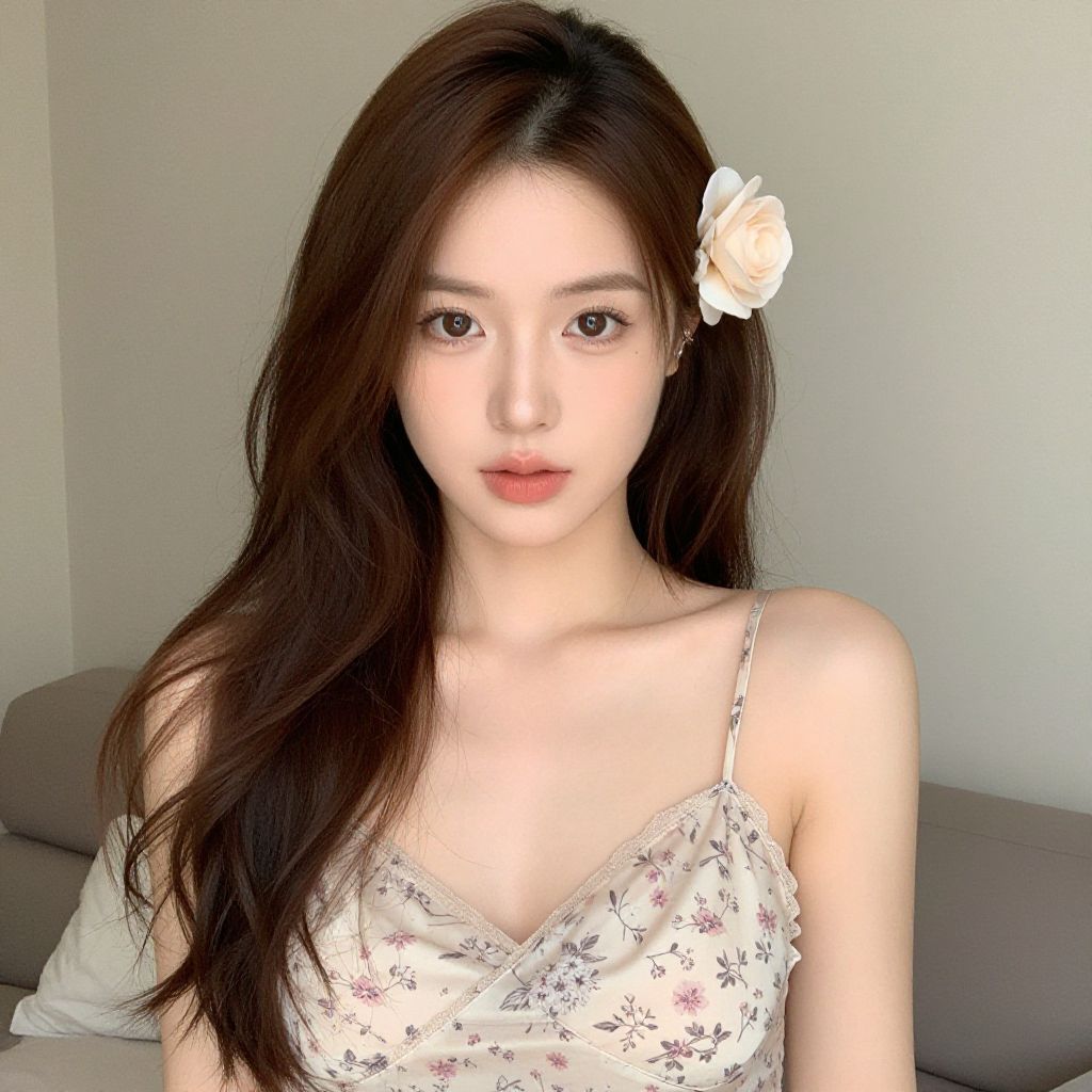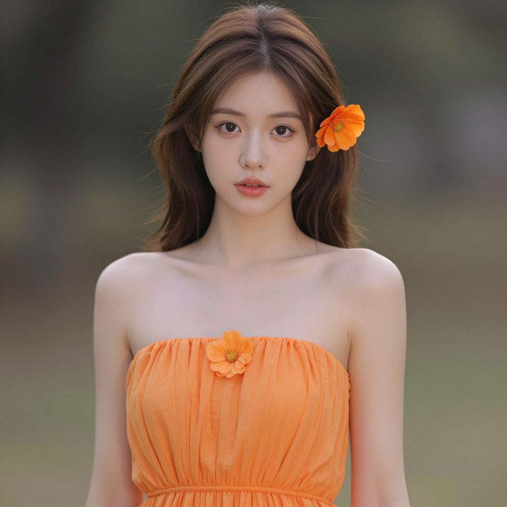 Photograph of an East Asian woman with fair skin and long, wavy brown hair. She wears an orange, strapless dress with a floral button in the center and an orange flower in her hair. Her expression is neutral, with slightly parted lips and soft, brown eyes. The background is blurred, featuring green and brown hues, suggesting an outdoor setting. The lighting is natural, highlighting her delicate features and the vivid color of her dress and flower. The overall style is soft and ethereal, with a focus on natural beauty and simplicity.