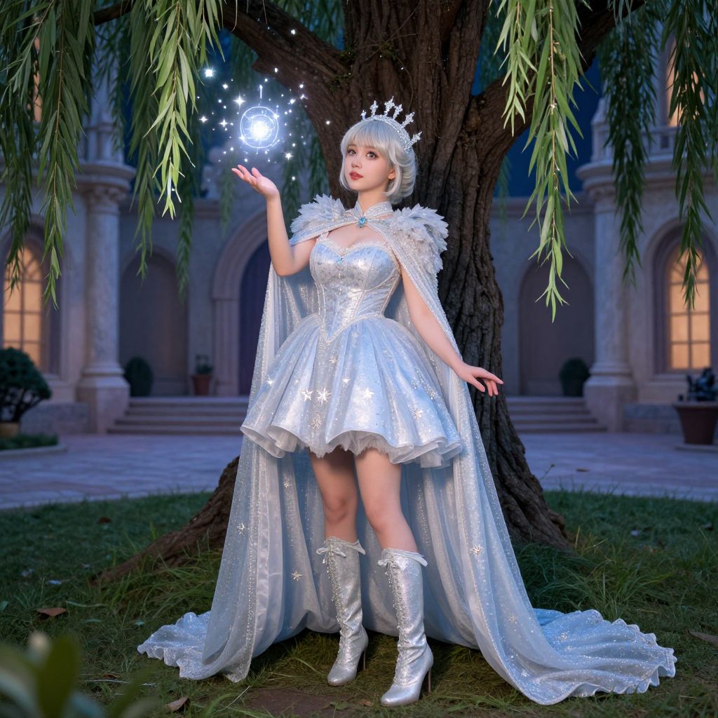A high-resolution photo of a fairy godmother in her signature costume—complete with a flowing, star-shaped dress, glittery boots, and a long bejeweled cape—standing under a enchanted willow tree in a moonlit courtyard of a magical palace, the woman has a youthful face with large expressive eyes, fair skin, and a gentle expression as she gestures toward a sparkling transformation spell in the air.. The woman has big tits and cute face