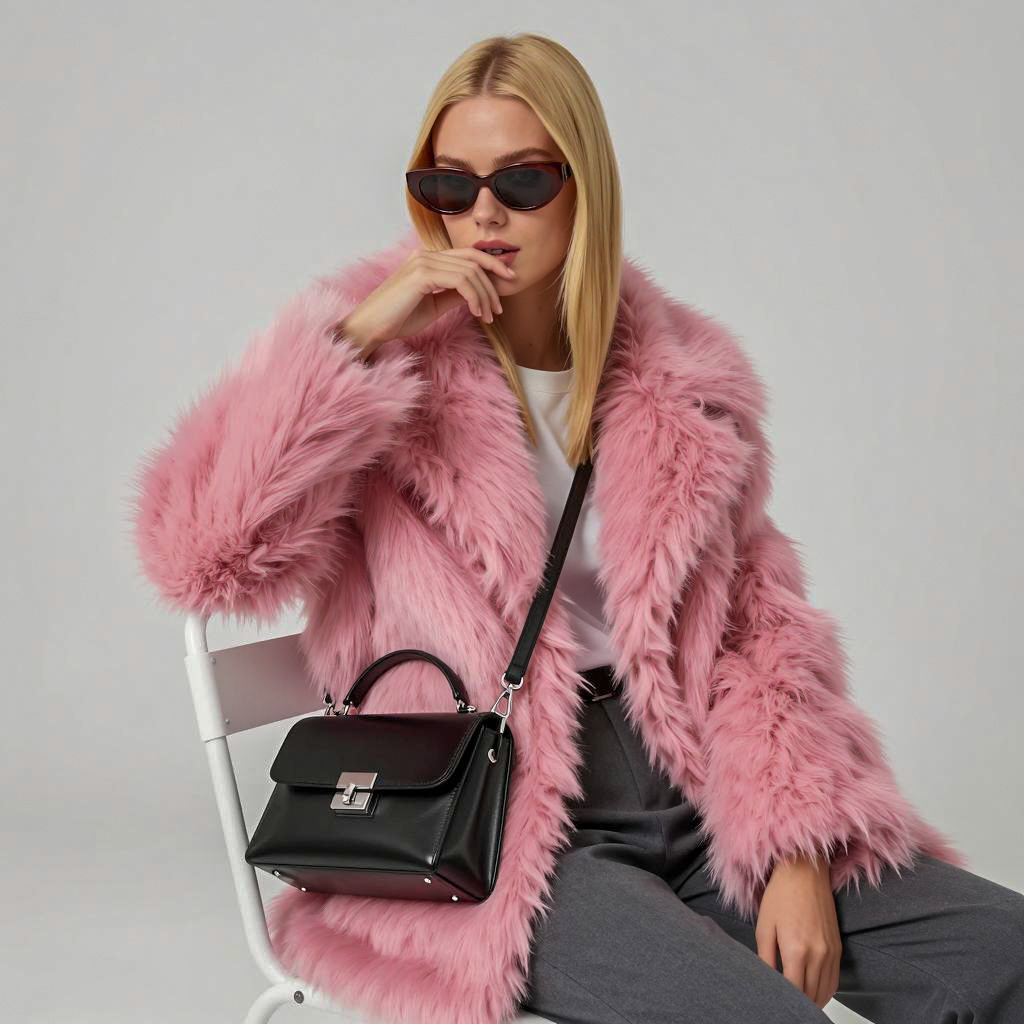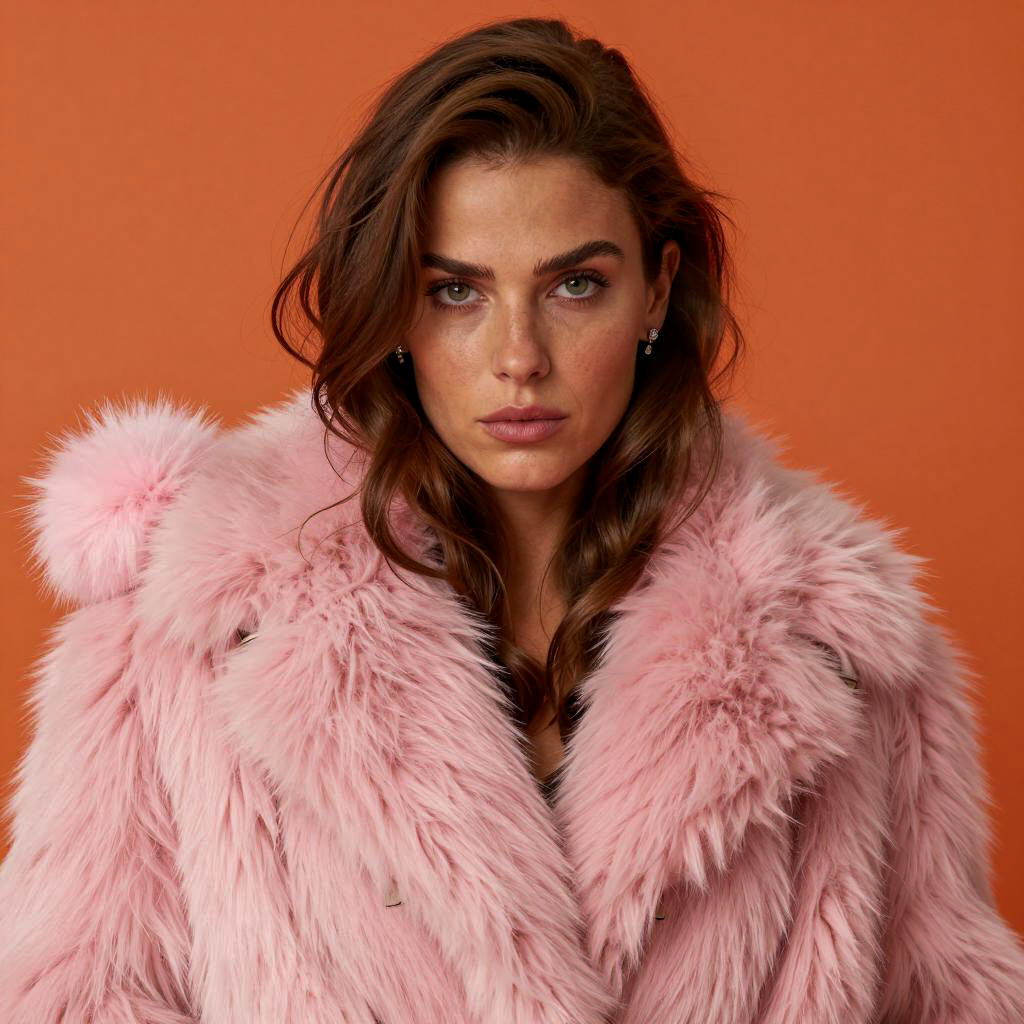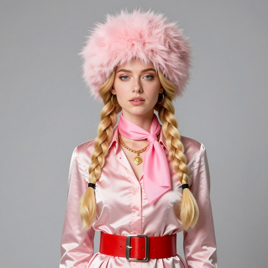 Inappropriate costume woman, photograph of a woman, pink fluffy hat, long blonde braided hair, wearing pink satin long-sleeve shirt, gold necklace, pink scarf, red belt, neutral background, studio lighting, portrait, front view, realistic, fashion, vintage style