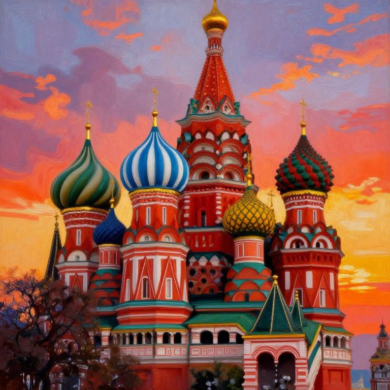 A vibrant oil painting by Lentulov, Aristarkh, depicting St. Basil's Cathedral with bold, saturated colors and dramatic lighting, showcasing the iconic onion domes and intricate architectural details against a vivid sunset sky, rendered in a highly detailed and realistic style.