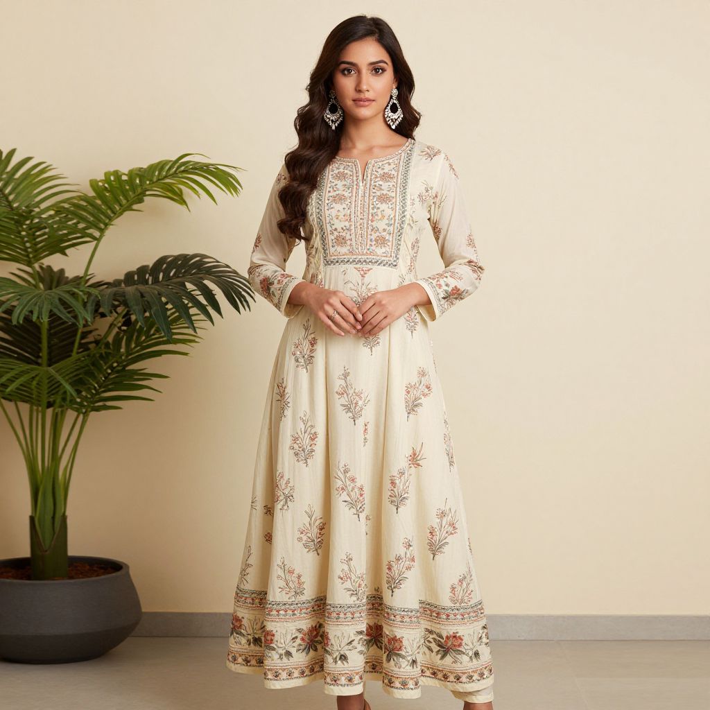Anarkali suit honey, 1girl, solo, brown hair, dress, long hair, earrings, jewelry, floral print, looking at viewer, plant, standing