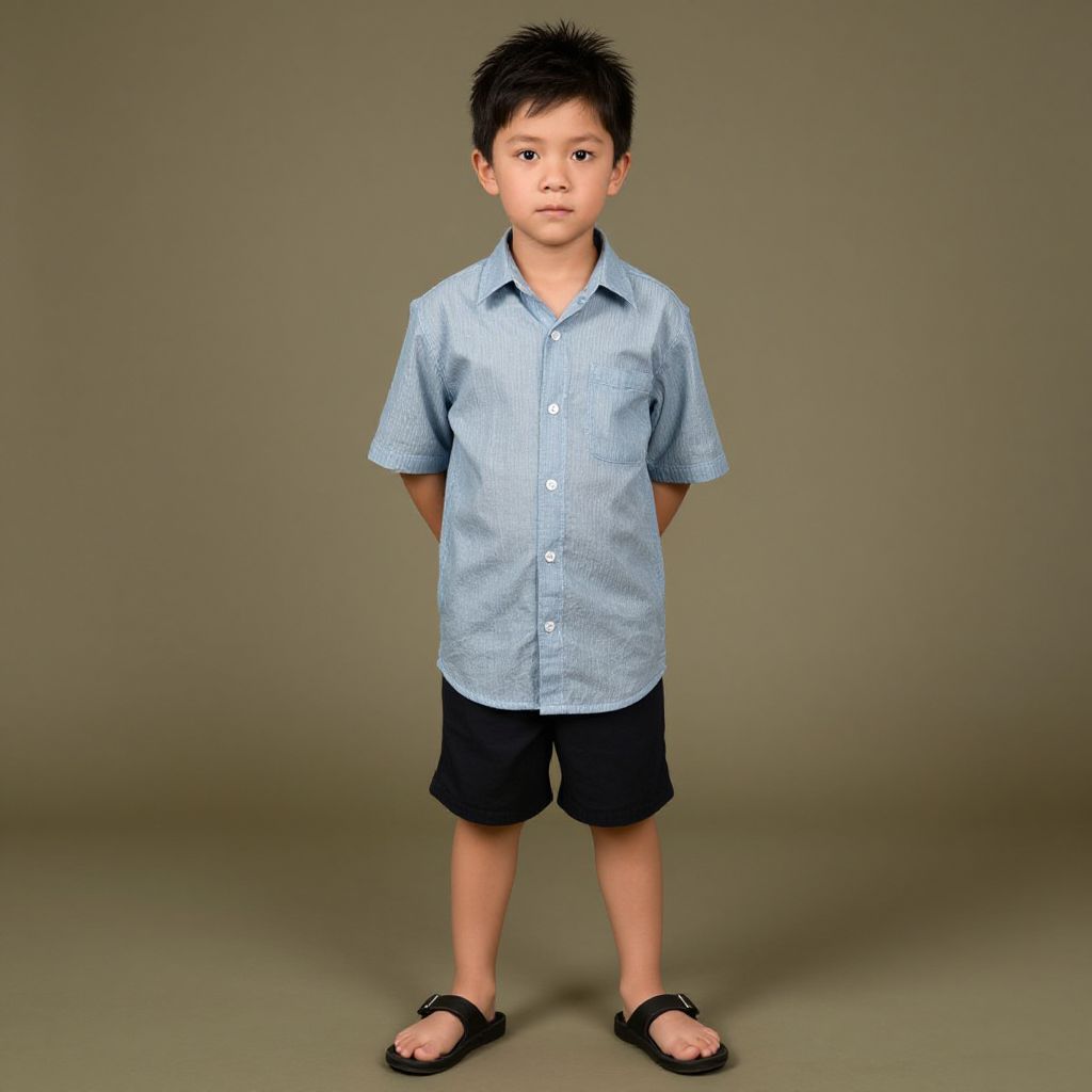 Photograph of a young Asian boy standing against a plain, beige background. He has short, black, spiky hair and a neutral expression. He wears a light blue, short-sleeved, button-up shirt with subtle vertical stripes, black knee-length shorts, and black flip-flops. His arms are behind his back. The lighting is even, with no shadows. The boy is centered in the image, and the overall composition is simple and focused on the subject.