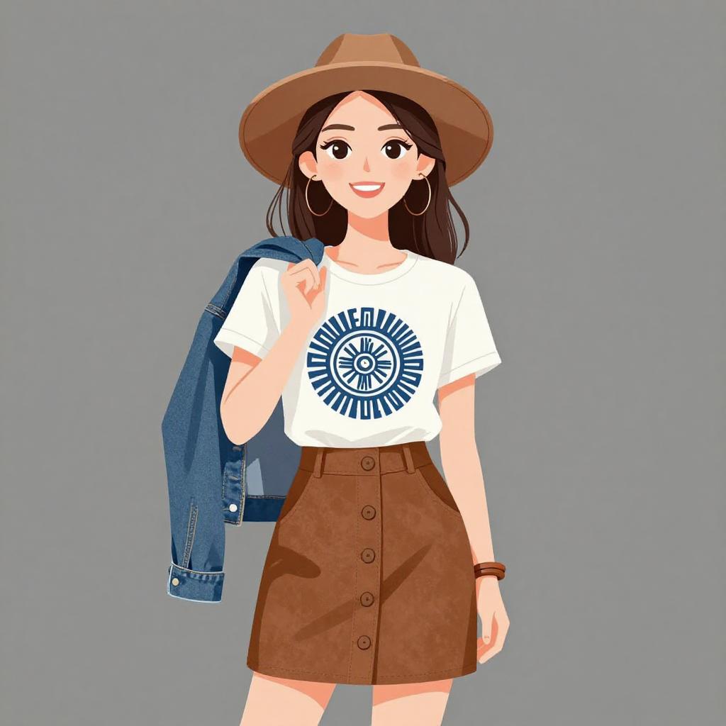 Woman with pretty face and pretty hair. smiling Woman, casual, white graphic t-shirt with blue tribal-inspired pattern, denim jacket draped over one shoulder, brown suede A-line mini skirt with front buttons, wide-brimmed felt hat in caramel, wooden bangle on wrist. --sref 1467