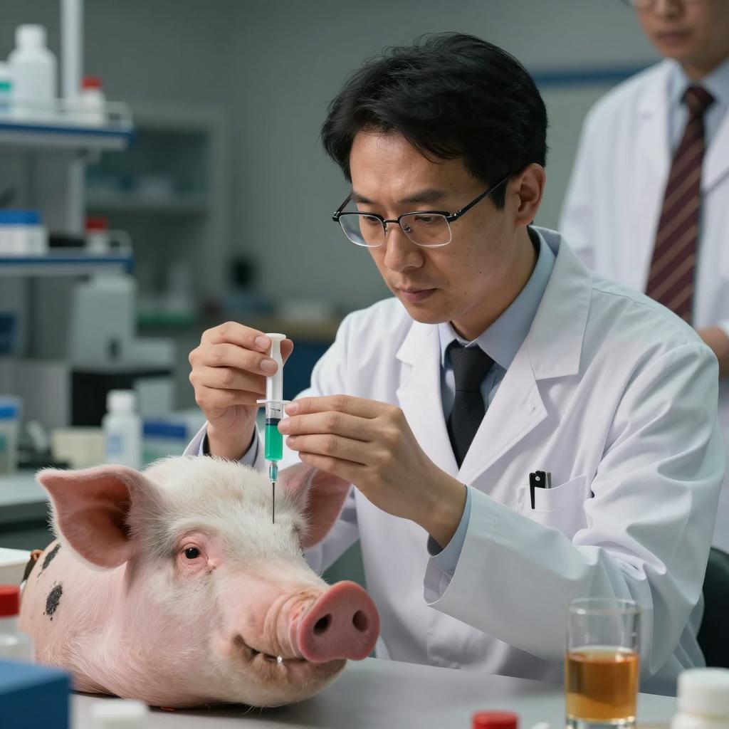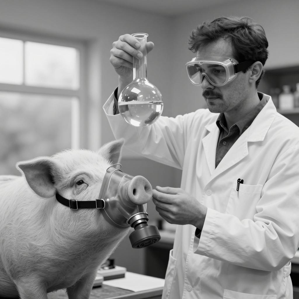 Male Scientist Conducting Experiment with Pig