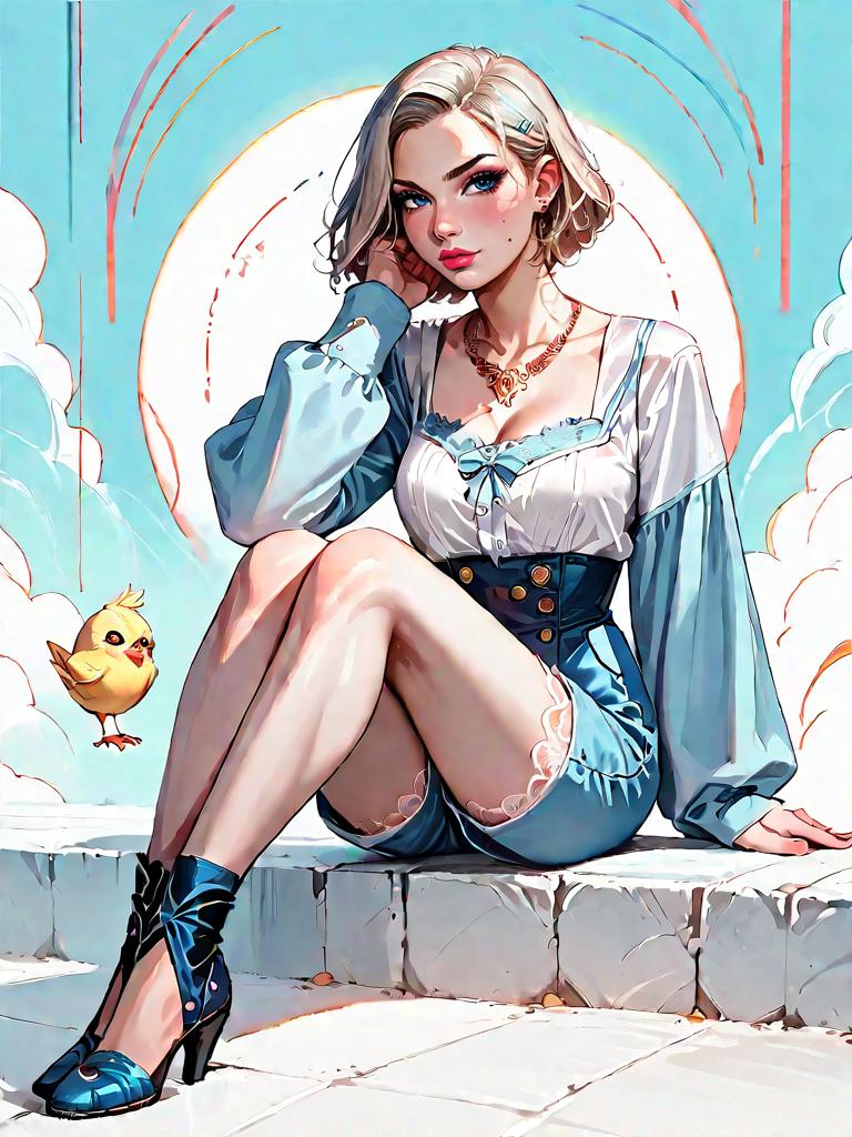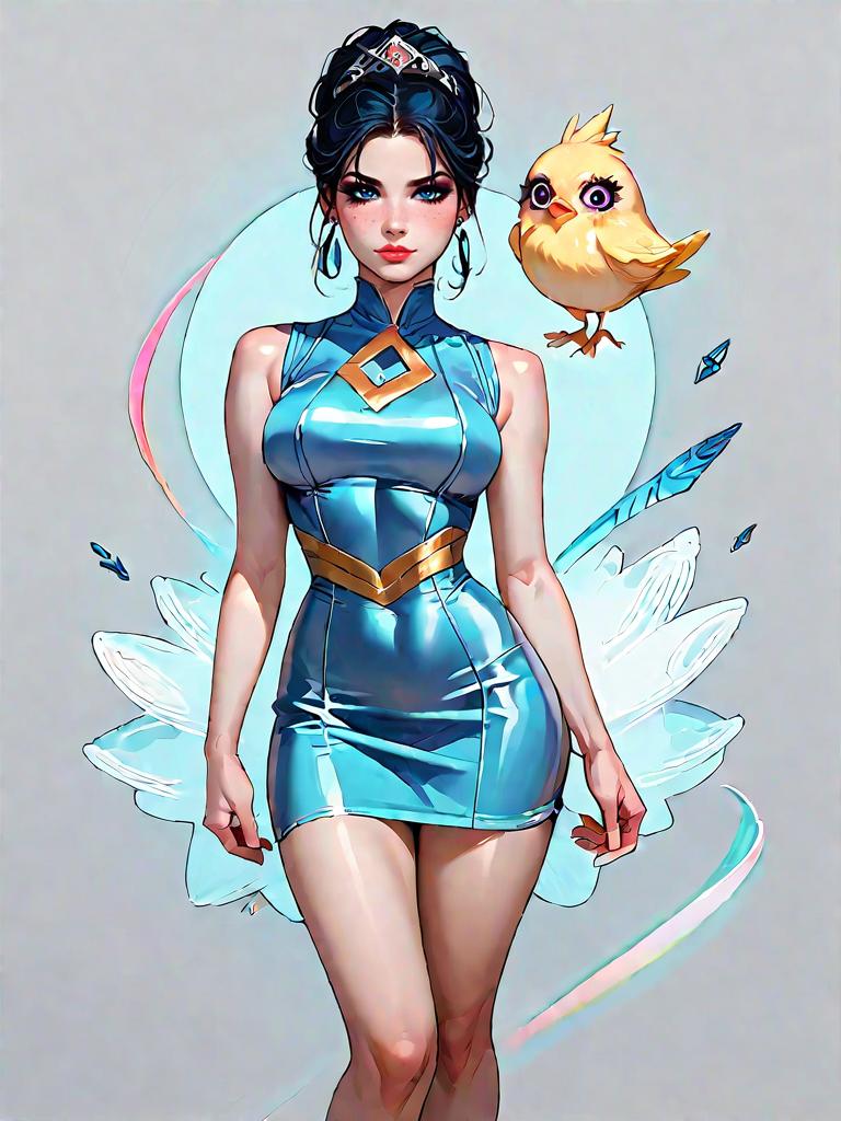 Digital illustration of a stylish woman with short black hair wearing a sleeveless blue dress with cut-out details and an asymmetrical hemline, kneeling in shallow water. Surrounding her are several cute, cartoonish yellow and blue birds against a bright blue sky with floating clouds.