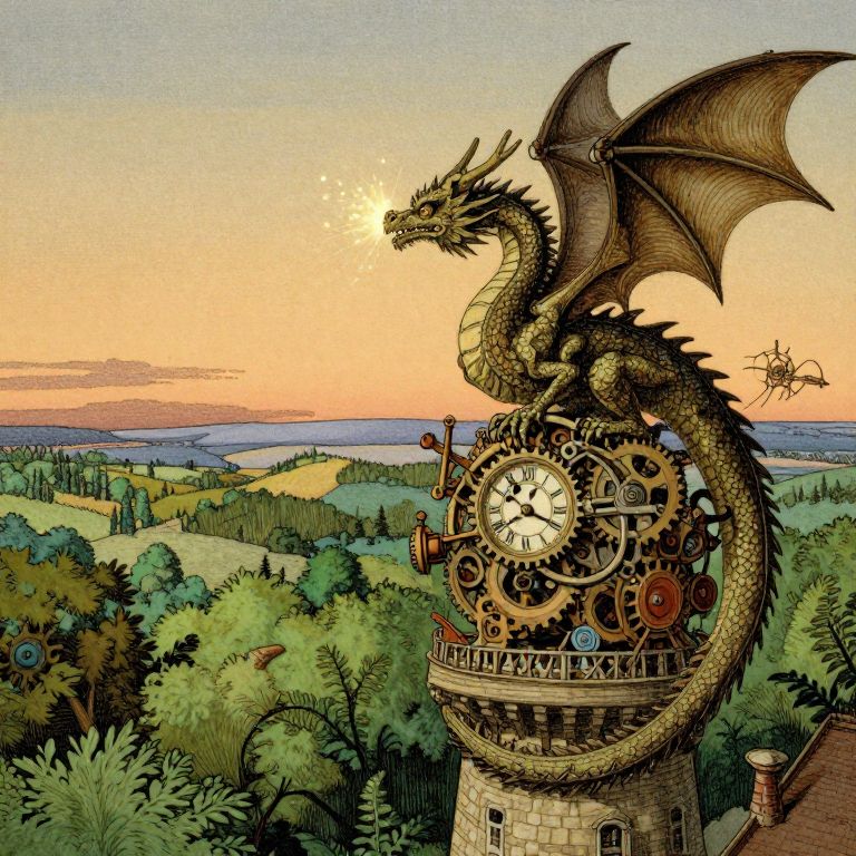 Craft an image in the whimsical style of Rackham-inspired illustrations, depicting a captivating 'bug's-eye view' scene of a complex clockwork dragon perched atop a tower, its gaze fixed on a verdant, imaginative landscape during twilight. As it rotates its gears and emits gleaming specks from its eyes, the creature appears almost alive, invoking feelings of awe and serenity within the observer. This exquisitely detailed piece should embody Rackham's intricate pen-and-ink craftsmanship with harmonious, earthy hues that seamlessly merge into the deepening dusk, infusing the image with a sense of eternal enchantment and intrigue.