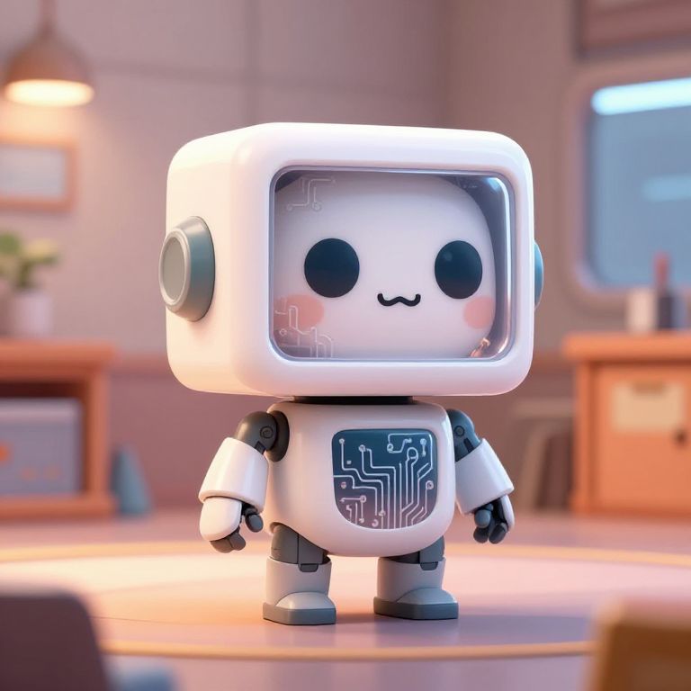 Cute robot character design, compact and boxy shape, detailed circuit patterns visible beneath transparent panels, cheerful and curious expression, set in a cozy futuristic room
