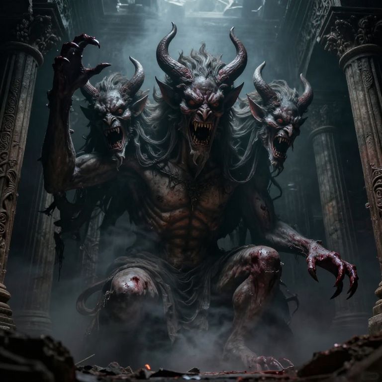 3 headed demon in a ruined temple, bloodstained claws reaching out, each head with distinct expressions of rage, horror, and cunning, engulfed in dark mist, intricate gothic textures