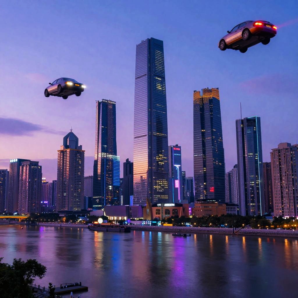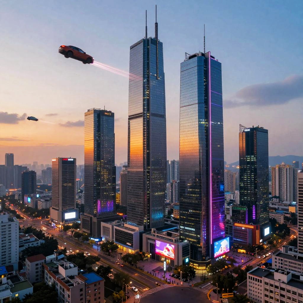 Maicraf futuristic cityscape at sunset, neon lights reflecting off glass skyscrapers, flying cars weaving through tall towers, vibrant colors with a cyberpunk atmosphere, detailed architecture and bustling streets, digital art