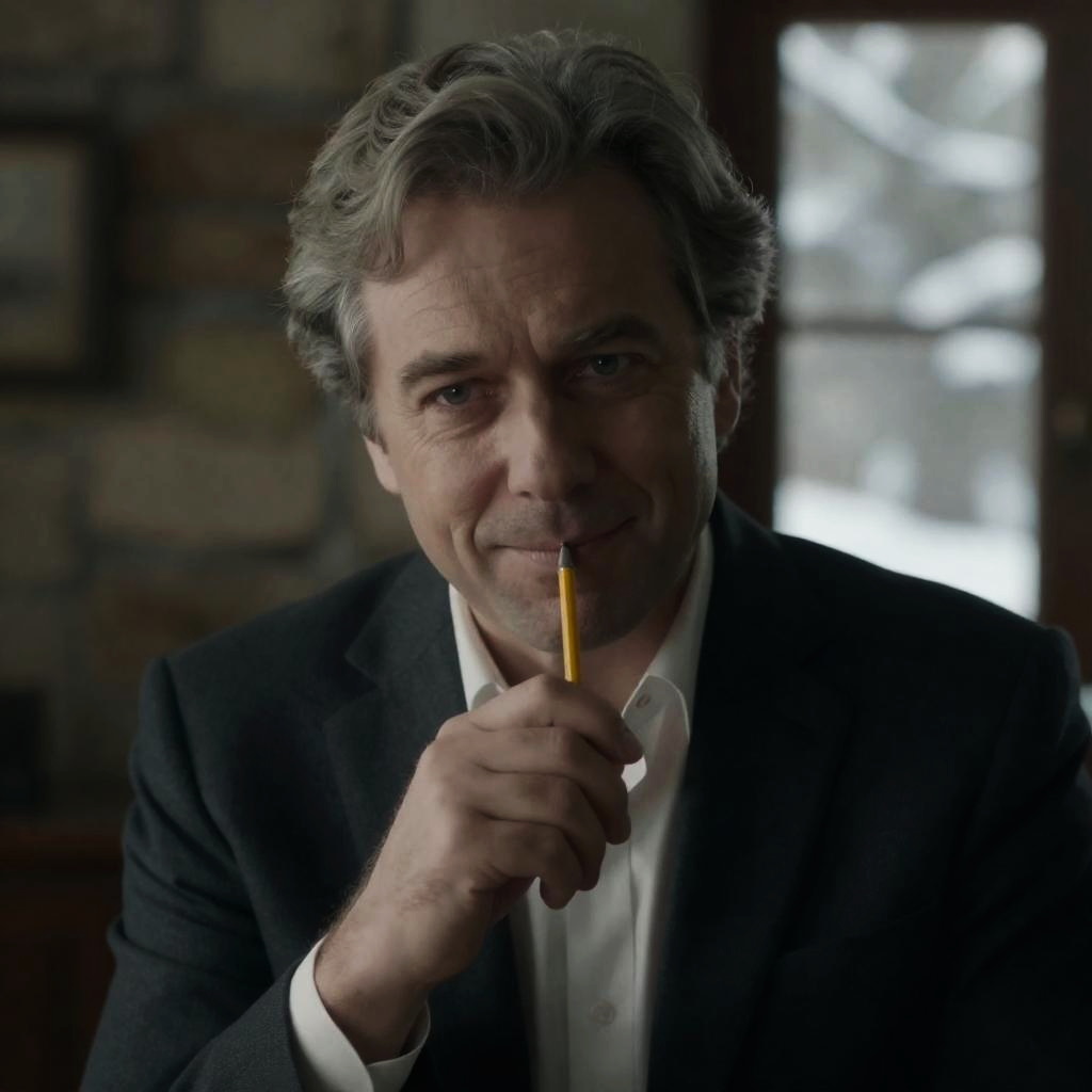 Middle-aged man with light brown hair, slightly disheveled, wearing a dark suit, adjusting his tie. He has a neutral expression. He is sitting on an ornate, dark floral-patterned couch. Background includes blurred flowers and soft light. Dimly lit room.