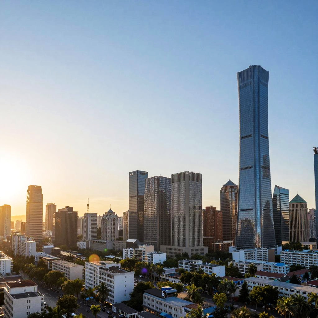 Lens flare removal applied to a vibrant cityscape at sunset, showcasing crystal clear skies and sharp architectural details, emphasizing the absence of glare to enhance visual clarity and color accuracy, ultra-realistic photography style.