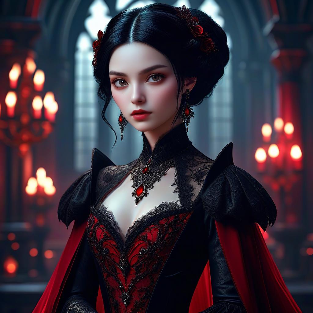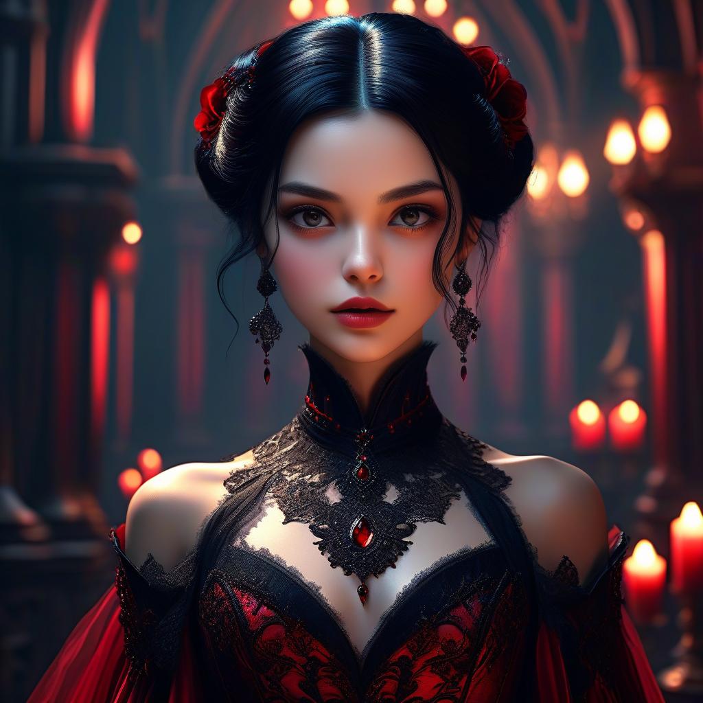 Elegant vampire with sleek black hair, showcasing alluring charm, vibrant crimson tones, high quality, detailed, digital art, professional, captivating face, wearing a lavish gown and gothic accessories, fantasy, mystical lighting, mystical atmosphere, detailed eyes, professional lighting
