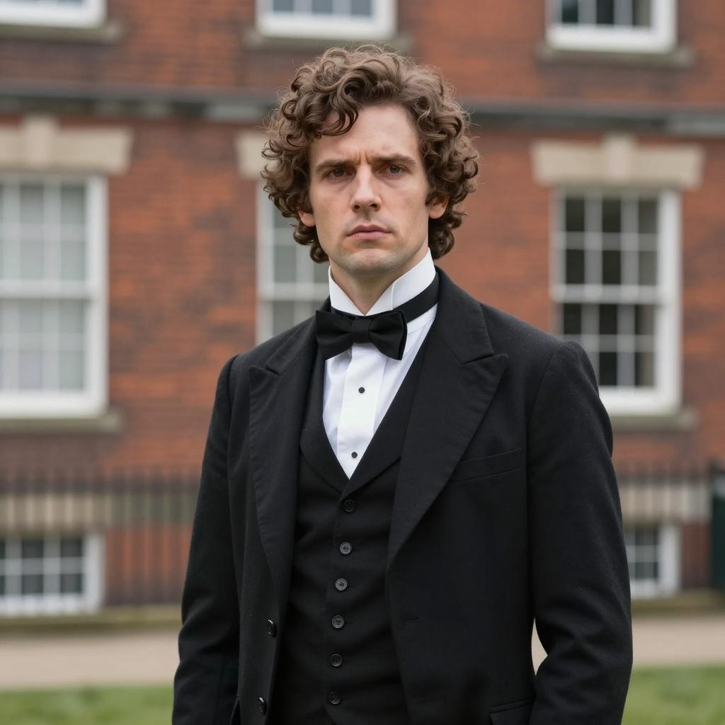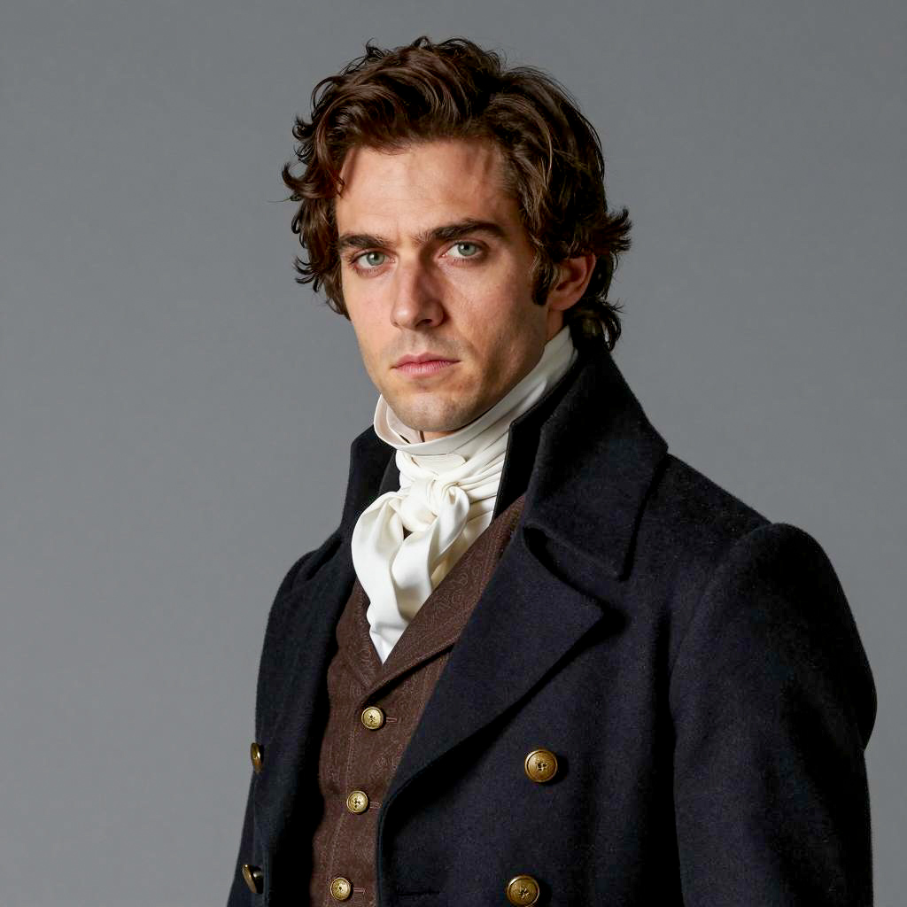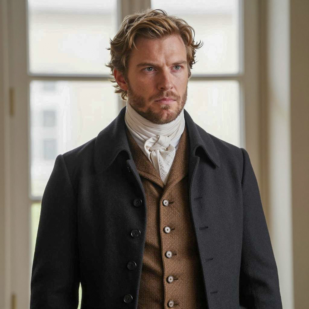 Arno dorian costume, photorealistic portrait of handsome man, Victorian-era fashion, dark brown hair, serious expression, green eyes, white cravat, brown vest, black overcoat with gold buttons, neutral gray background, studio lighting, upper body shot, slight side lighting, medium close-up, realistic ures, detailed facial features, high contrast, semi-formal attire