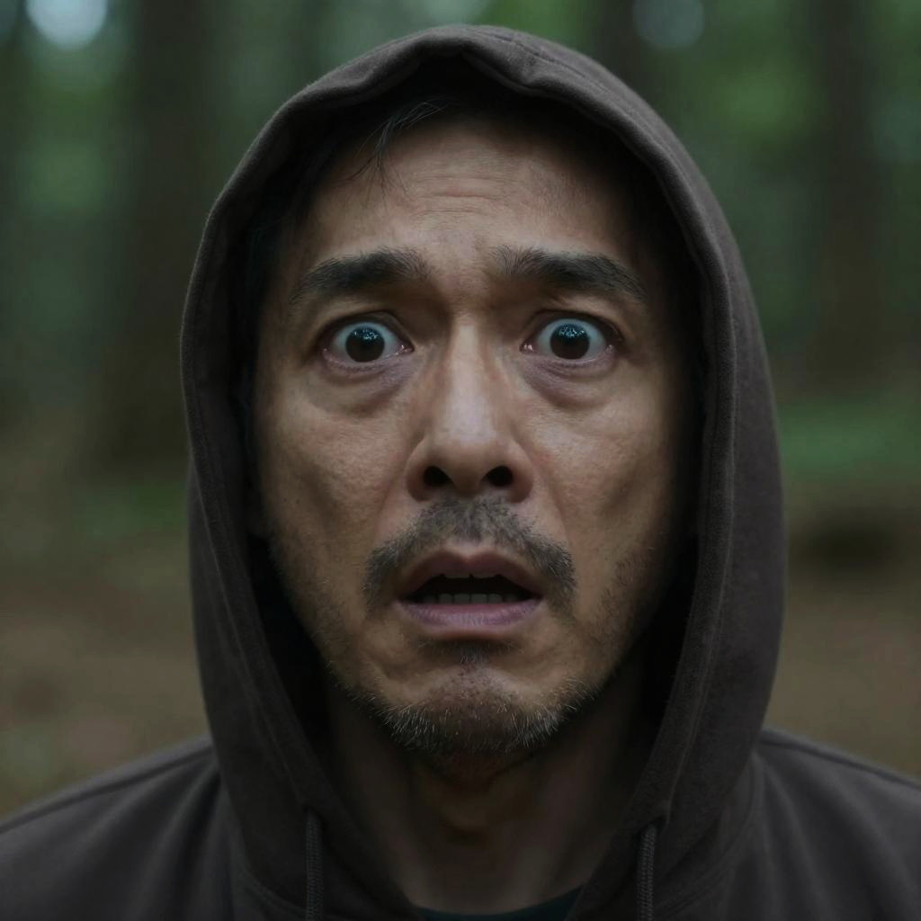 Close-up photograph of a middle-aged man with wide, terrified eyes and open mouth, wearing a dark brown hood. Green and brown forest background. His face has gray stubble and visible wrinkles. Man's expression is intense fear.