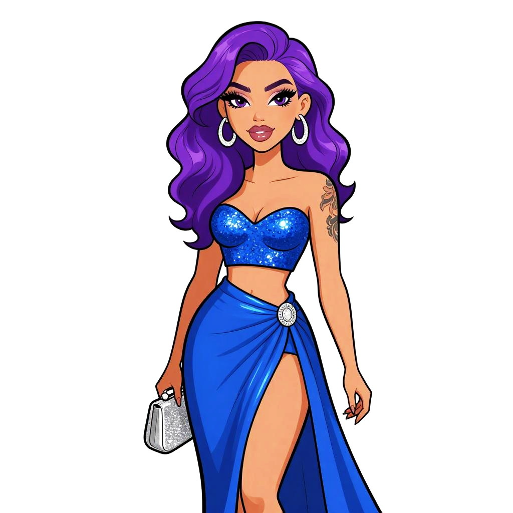 Woman with pretty face and pretty hair. Woman, contemporary glam, metallic blue crop top, strapless, paired with a matching asymmetrical skirt, high waist, thigh-high slit, flowing tail, silver glitter clutch, tattoo on arm, white studio background --sref 1467