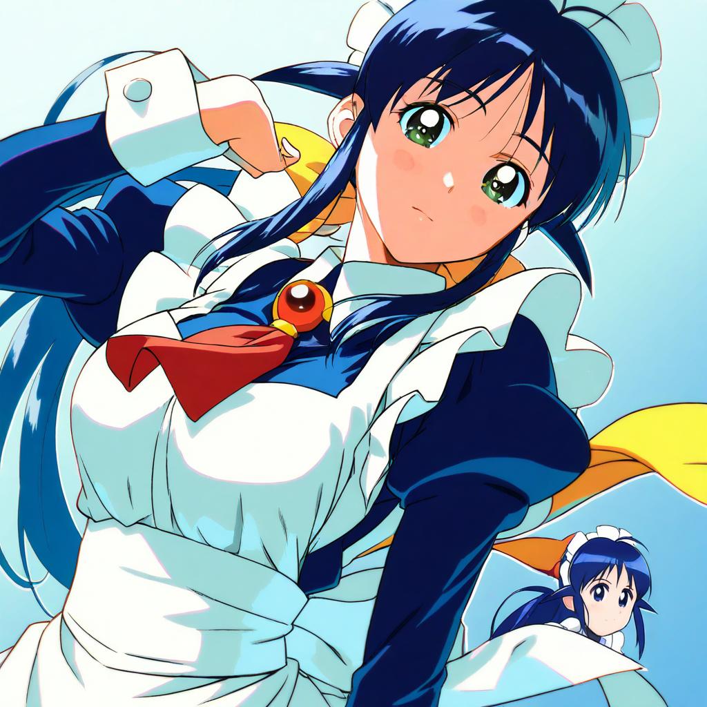 Andou mahoro, mahoromatic, 1girl, maid, maid, maid headdress, green eyes, long hair, blue hair, by artist aduti momoyama, animagine