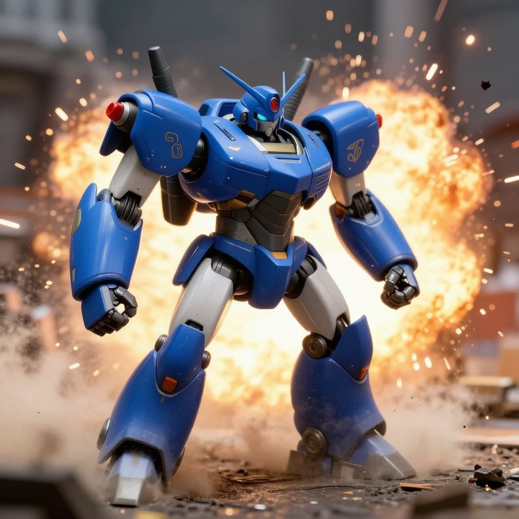 Tachikoma, score_9, score_8_up, score_7_up, score_6_up, score_5_up, score_4_up, signature, robot, mecha, science fiction, realistic, battle, explosion, firing, dust, sparks, blue colored robot