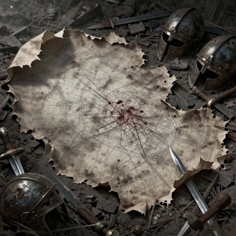 This photograph depicts a torn, antique map with intricate, faded lines and symbols, lying on a dark, debris-strewn ground. The map, with a central bloodstain, is surrounded by scattered, reflective metal helmets and fragments of broken objects. The map's edges are frayed, revealing aged, yellowed paper. The background is shadowy, with a gritty texture, enhancing the map's worn, historical appearance. The image has a high-contrast, almost surreal quality, emphasizing the map's significance and the surrounding chaos.