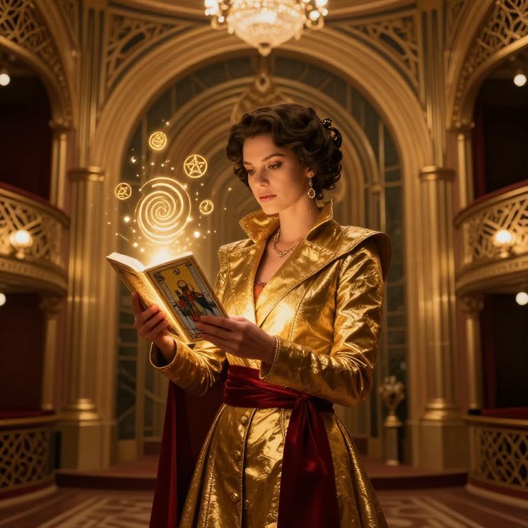 A mystical tarot reader surrounded by an ornate Art Deco-style theater setting with grand arches and gilded pillars, wearing a tailored gold-trimmed coat with a deep red sash, her face illuminated by soft golden light, reading from a glowing tarot deck as golden symbols like a spiral and a pentacle float above her hands in a dreamy, otherworldly atmosphere.