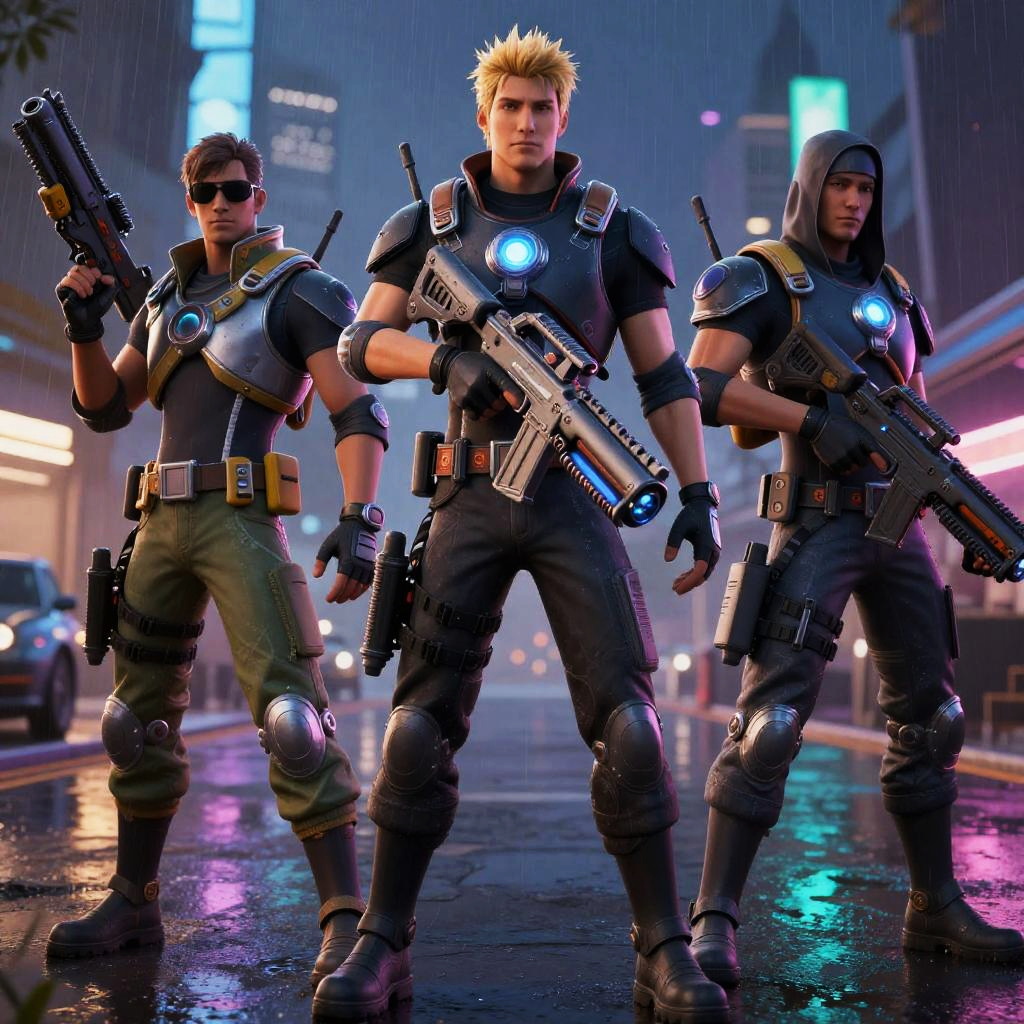 Fortnite male characters equipped with sci-fi weapons, urban nighttime environment, dramatic lighting with rain effects, photorealistic style