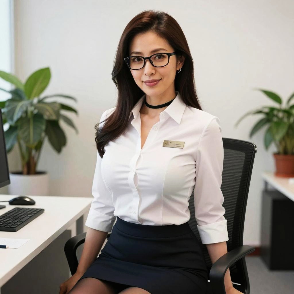 ((best quality)), absurdres, (ultra high res), (photorealistic:1.6), octane render, (hyperrealistic:1.2), (photorealistic face:1.2), mature woman, office lady, white clothes, clothes cutout, black skirt, brown hair, glasses, ponytail, thighhighs, vertical-striped thighhighs, desk, looking at viewer, naughty face, perfect female body, (realistic:1.7), (8k), (Masterpiece), (realistic skin texture), (soft lighting), (beautiful eyes:1)
