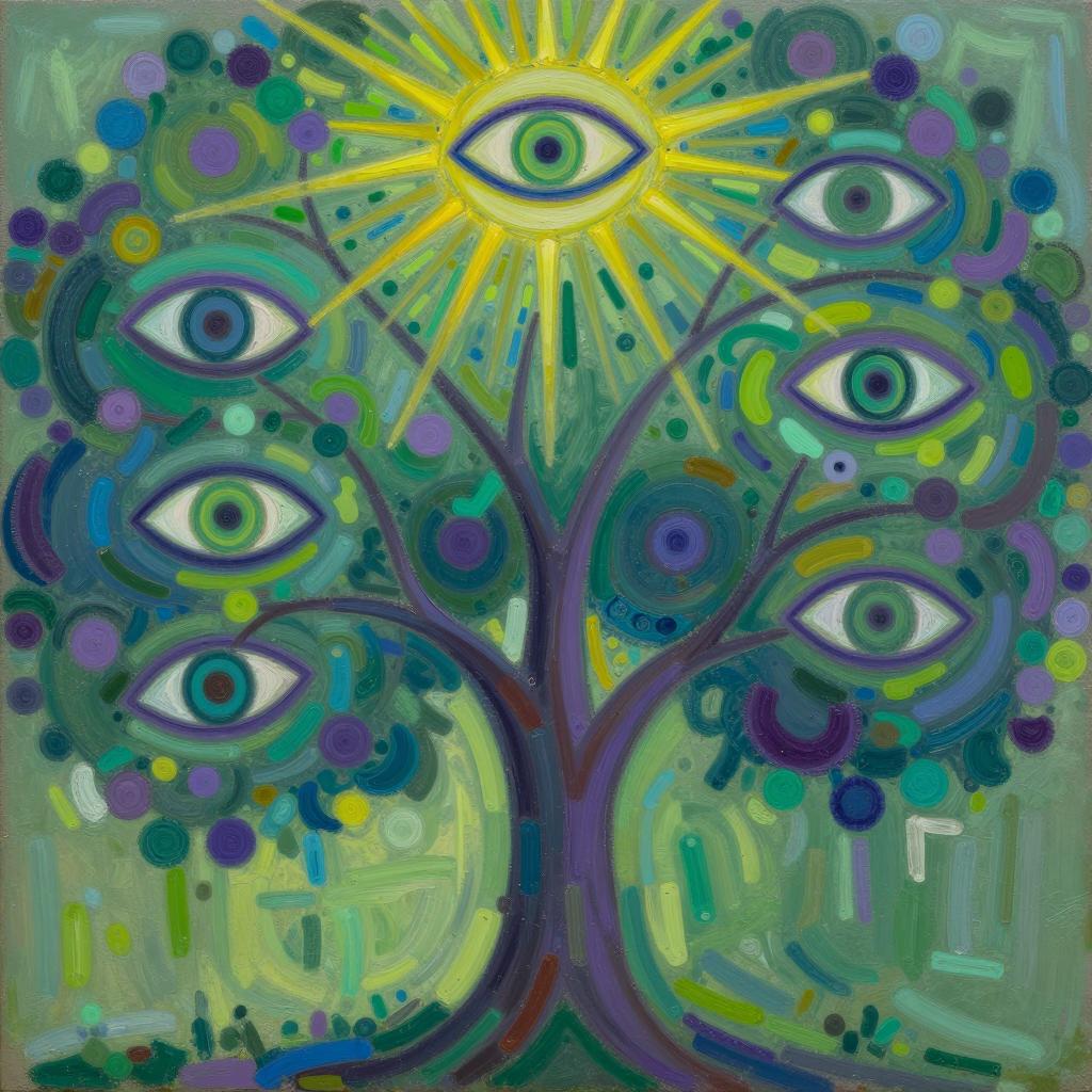 Vibrant abstract expressionist painting of a tree with eye-like shapes in its foliage. Dominated by bright greens and deep purples, inspired by Jackson Pollock's style, symbolizing nature's resilience with radiant sunrays shining through.