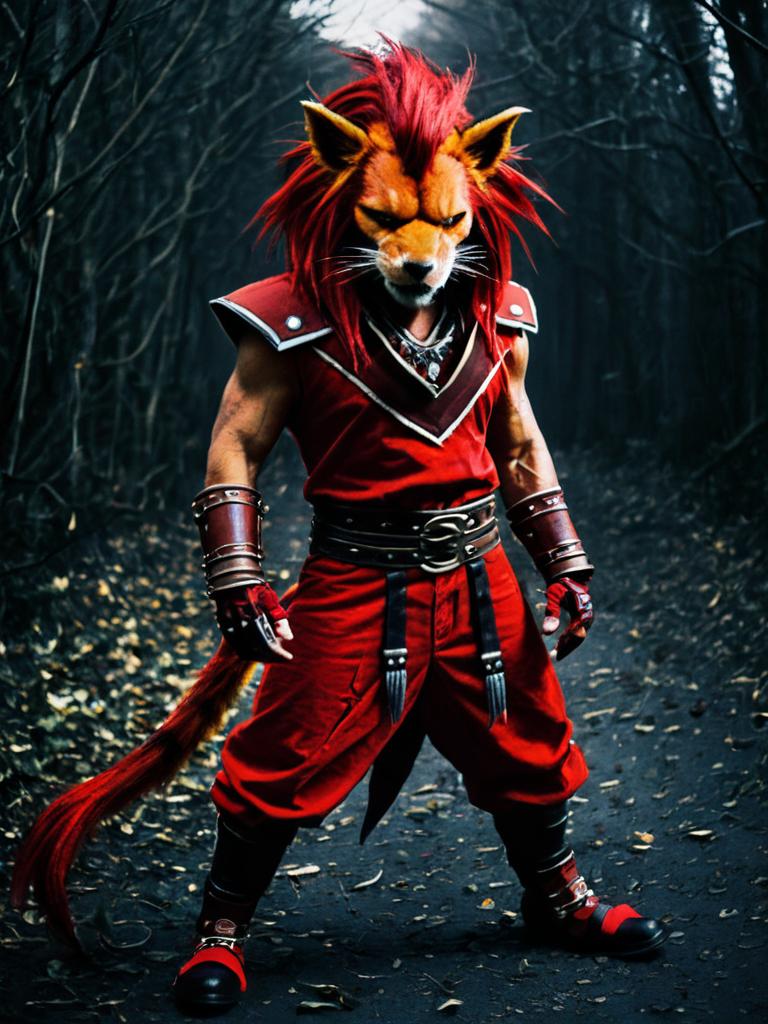 Man cosplay. Wearing Red XIII costume. Realistic photo. Dressed as Red XIII --sref 1399