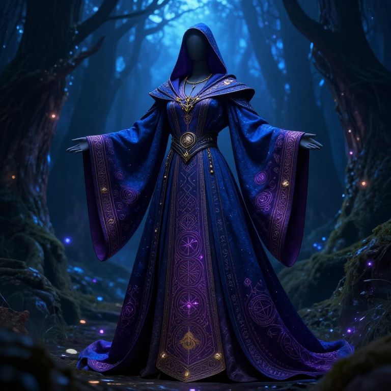 Digital art depicting a mysterious, faceless figure in a dark blue, ornate cloak with wide sleeves and intricate golden and purple patterns. The figure stands with arms outstretched in a forest illuminated by ethereal blue light, with glowing fireflies and misty trees in the background. The cloak features Celtic-inspired designs, a high collar, and a large, circular gold pendant at the chest. The figure's stance and the magical, otherworldly setting evoke a sense of mysticism and enchantment. The overall color palette is dominated by deep blues and purples, creating a mystical, nocturnal atmosphere.