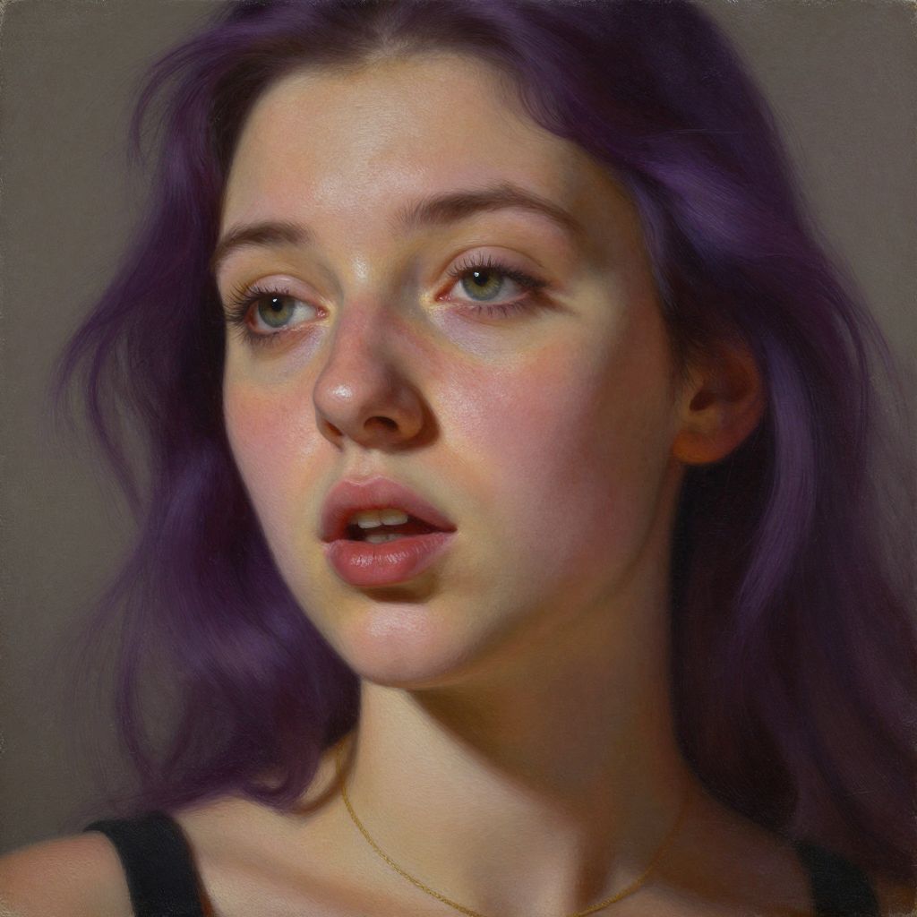 Craft a hyperrealistic oil painting portrait of a young Southern European woman with bold purple hair, her unfocused green eyes framed by thick lashes and full lips slightly parted as if whispering. Textured skin, visible pores, natural highlights, and subtle blemishes add authenticity. Capture this intimate moment from an unusual low-angle perspective, focusing on the intricate details of her delicate necklace and its soft reflection on her skin. The surrounding environment seamlessly blends into the background, drawing viewers into her captivating gaze while evoking introspection and vulnerability through atmospheric shadows.