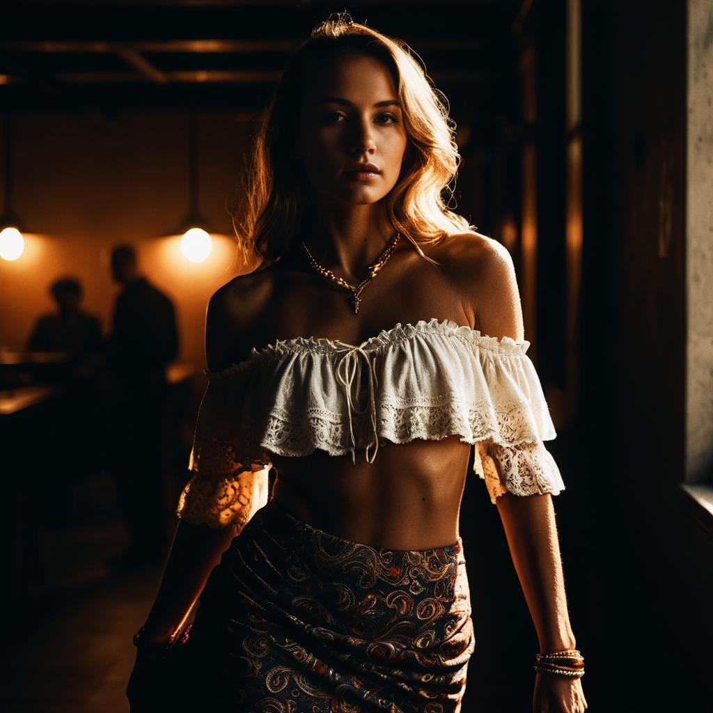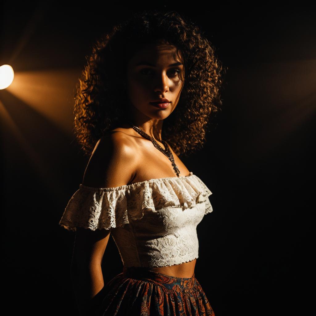 Elegant Woman in Ivory Lace Top and Paisley Skirt