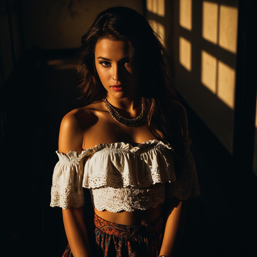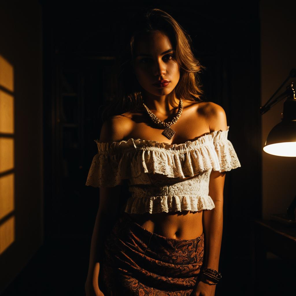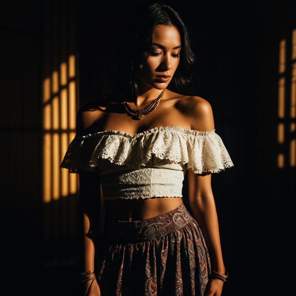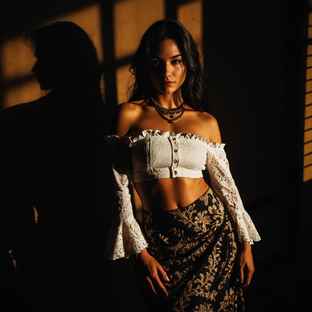 Photorealistic portrait of an Asian woman wearing an ivory off-shoulder cropped lace top with ruffle detailing paired with a long fitted paisley patterned skirt. She is accessorized with layered gold necklaces and thin bangle bracelets. The image features soft cinematic lighting with shadows casting through window panes, creating a dramatic and dreamy atmosphere.