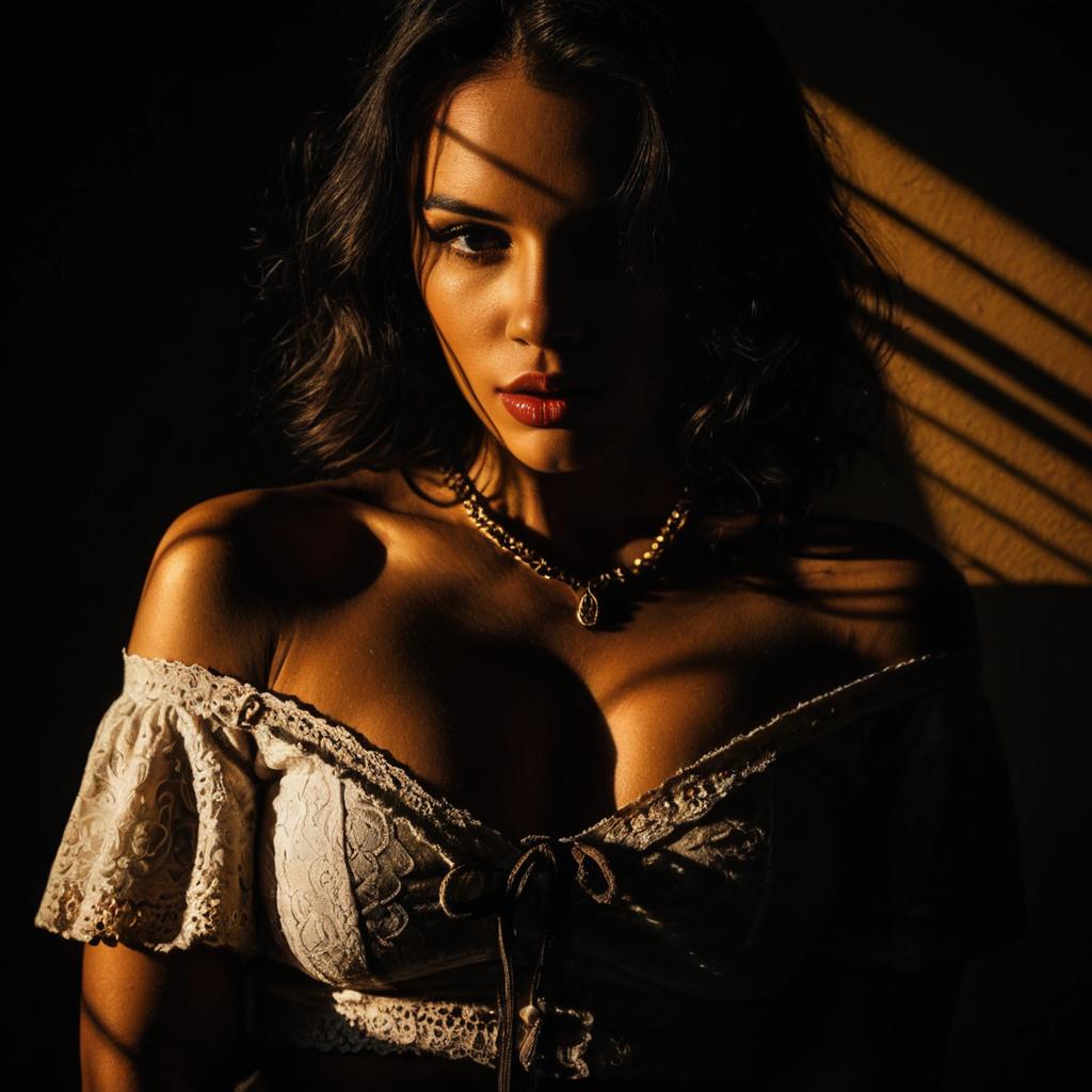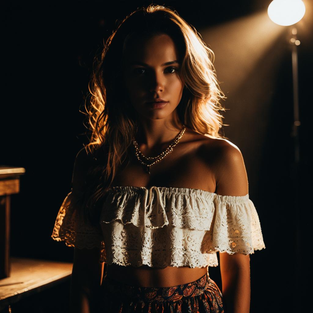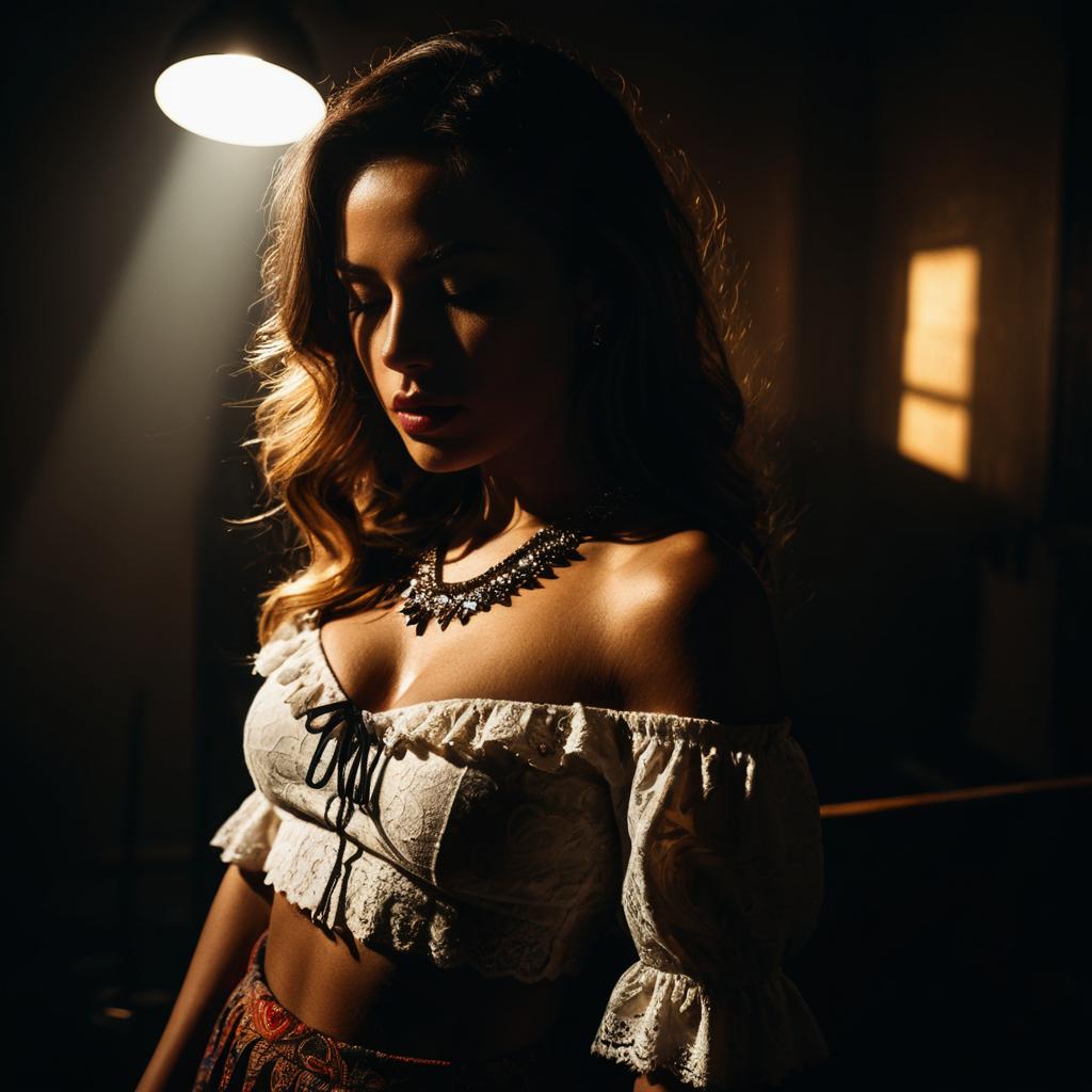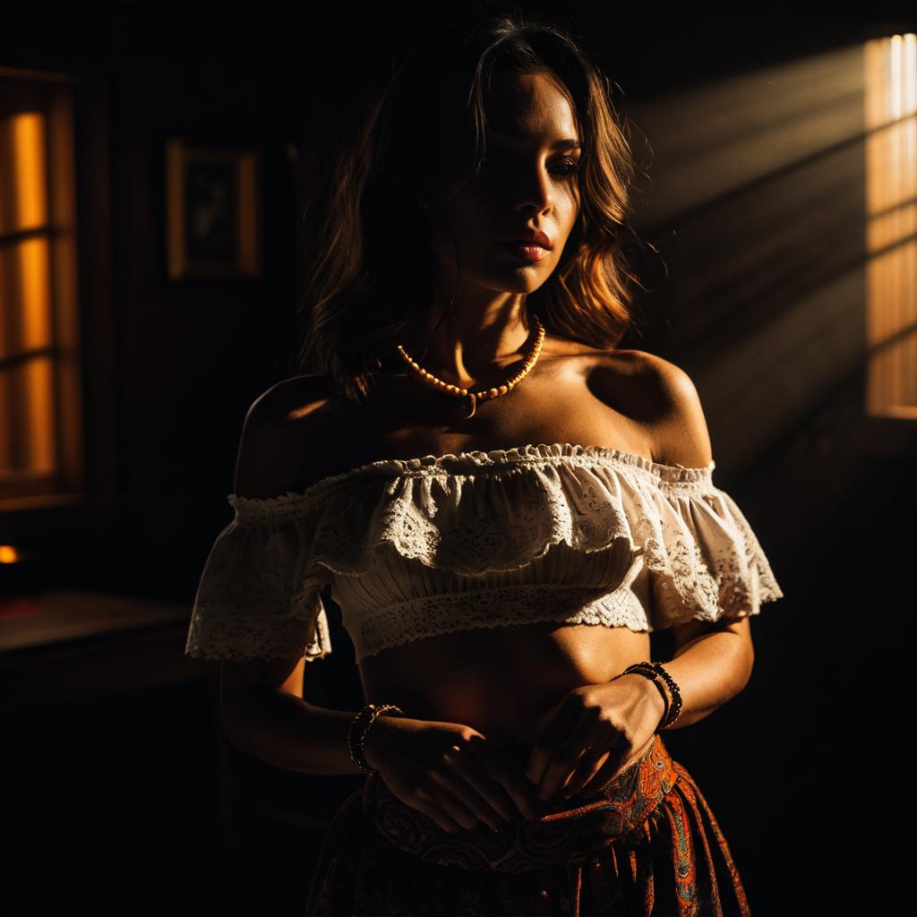 Photorealistic portrait of an Asian woman wearing an ivory off-shoulder cropped lace top with ruffle detailing paired with a long fitted paisley patterned skirt. She is accessorized with layered gold necklaces and thin bangle bracelets. The image features soft cinematic lighting with shadows casting through window panes, creating a dramatic and dreamy atmosphere.
