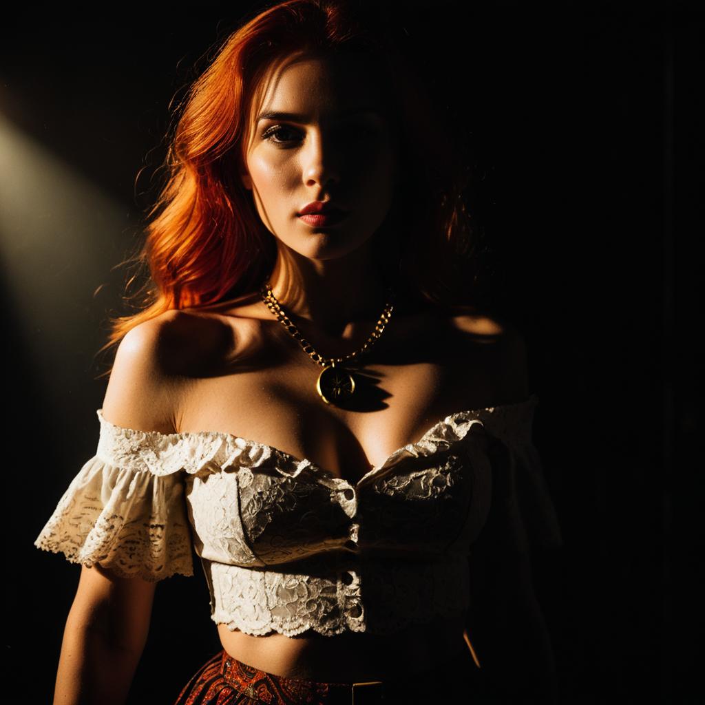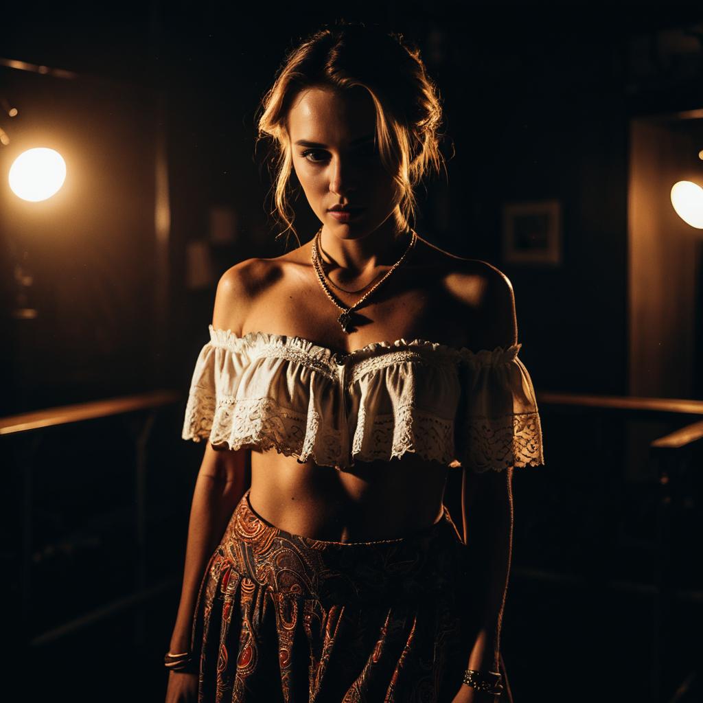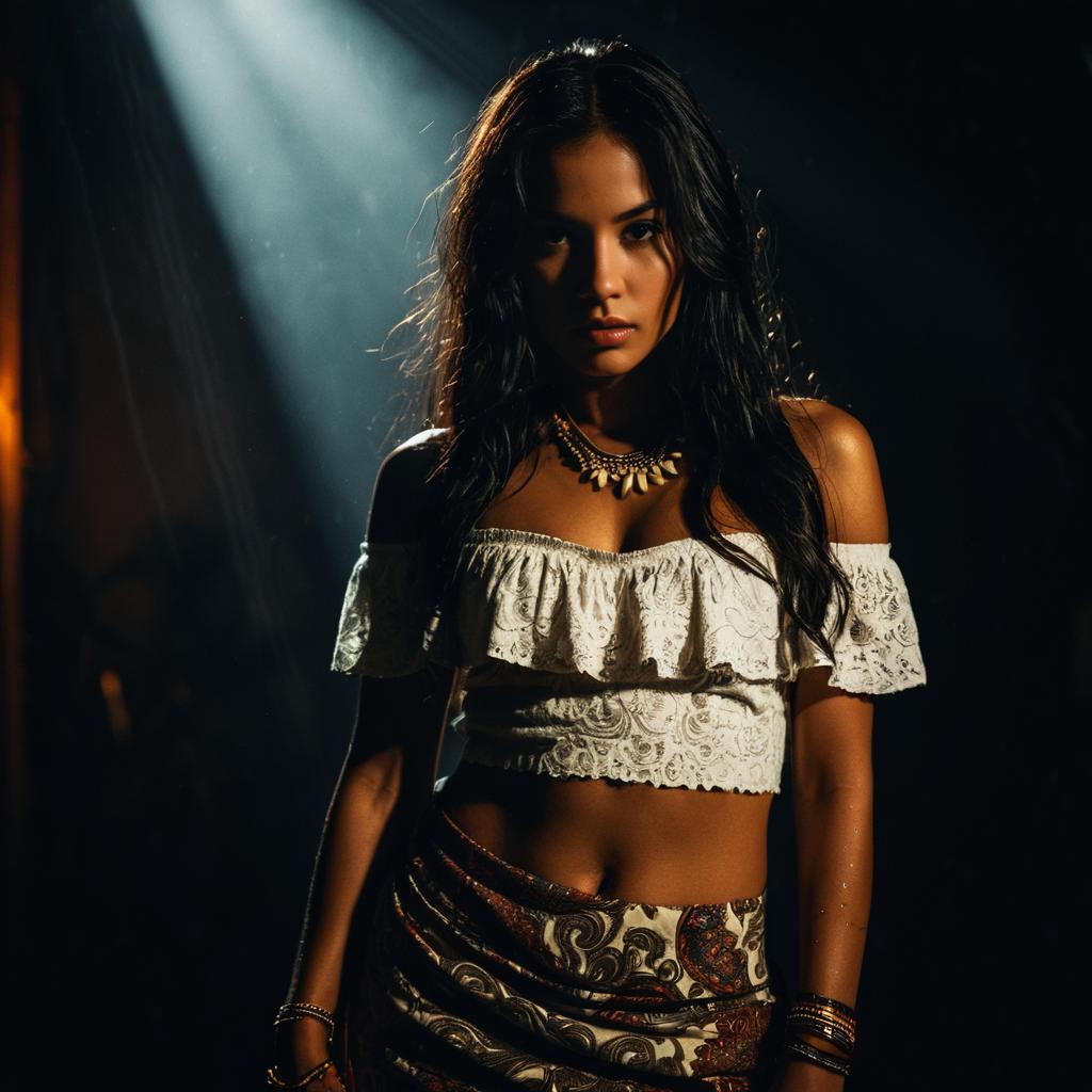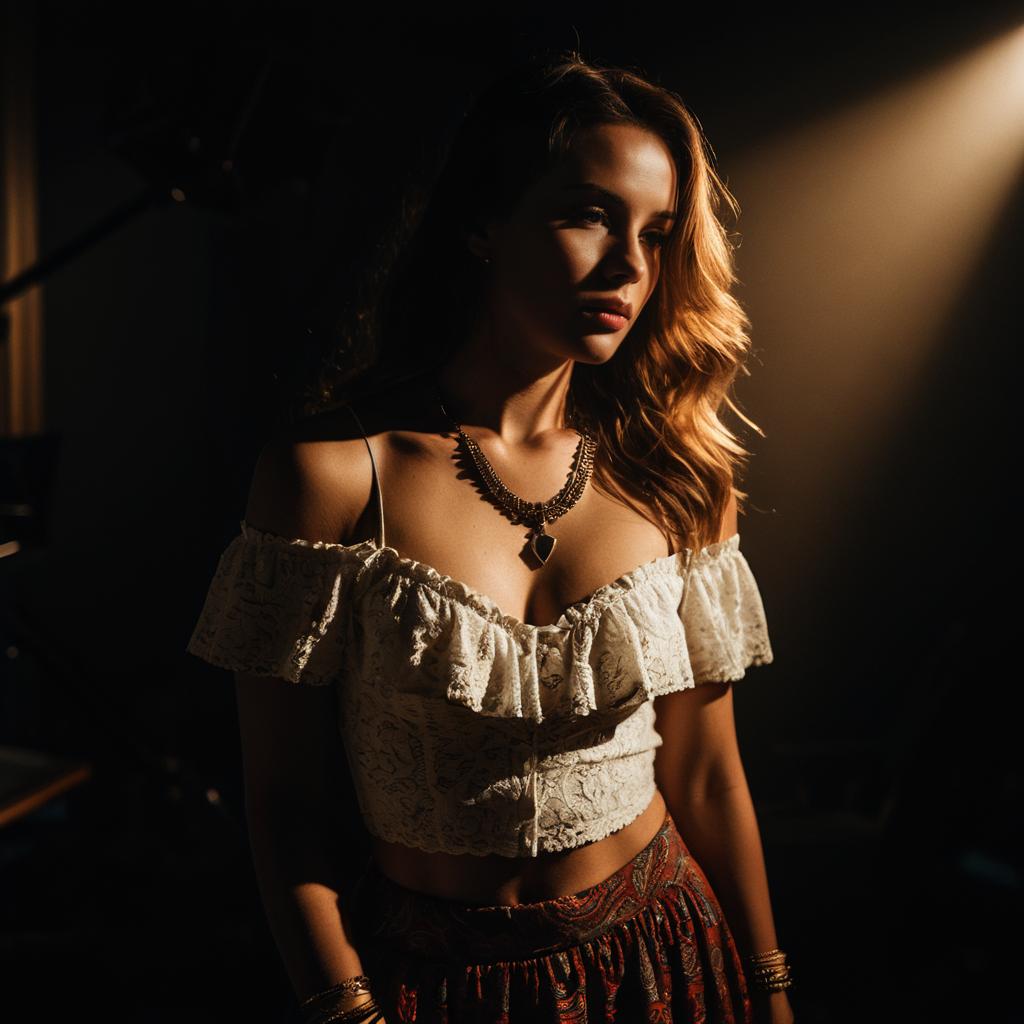 Photorealistic portrait of an Asian woman wearing an ivory off-shoulder cropped lace top with ruffle detailing paired with a long fitted paisley patterned skirt. She is accessorized with layered gold necklaces and thin bangle bracelets. The image features soft cinematic lighting with shadows casting through window panes, creating a dramatic and dreamy atmosphere.