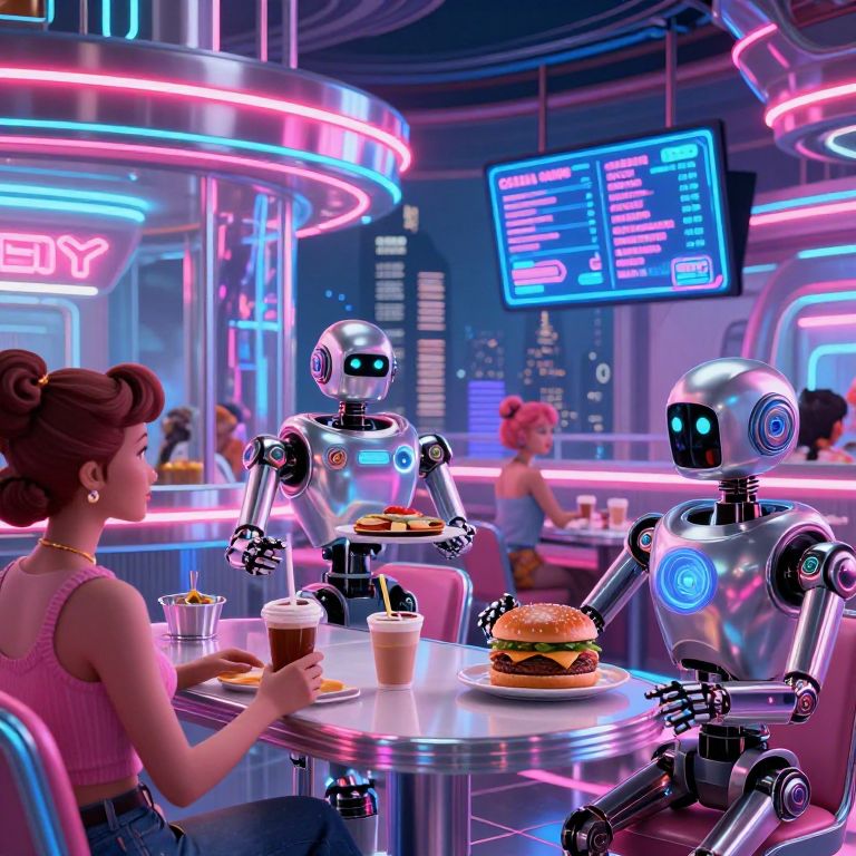 This vibrant digital illustration depicts a neon-lit futuristic diner. A retro-styled woman with curly brown hair and a pink sleeveless top sits at a chrome table, holding a coffee cup with a straw and a burger. Two silver robotic waiters with blue glowing eyes and spiral patterns on their chests serve her and another seated woman in a pink hairdo. The background features a neon sign reading "DINER" and a digital menu board displaying options. The scene is bathed in pink and blue neon lights, adding a cyberpunk aesthetic. The diner's interior includes curved chrome details, and the overall atmosphere is futuristic yet nostalgic.