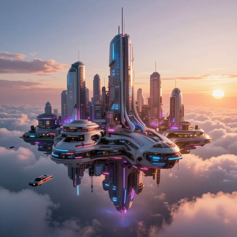 Photorealistic CGI of a futuristic, neon-lit cityscape floating among clouds at sunset, featuring sleek, towering skyscrapers with reflective surfaces and