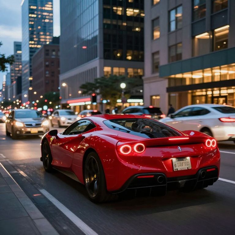 Glossy red sports car speeding along a bustling city street at dusk, its taillights glowing warmly as it navigates past other vehicles beneath towering skyscrapers illuminated by vibrant urban lights.