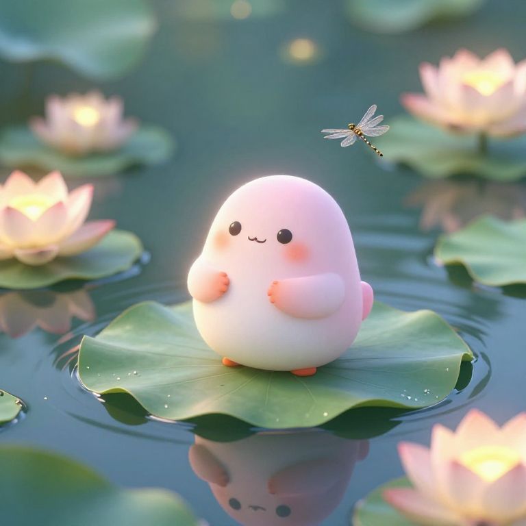 A digital illustration features a cute, chubby, white, round creature with pink cheeks, small black eyes, and orange feet, sitting on a green lily pad in a serene, reflective pond. The creature has a simple, happy expression and holds its hands up near its chest. Surrounding it are pink lotus flowers with glowing centers, and a tiny dragonfly hovers above its head. The background is a soft, blurred blend of blue and green, creating a tranquil atmosphere. The image has a whimsical, anime-inspired style with a focus on soft colors and gentle lighting.
