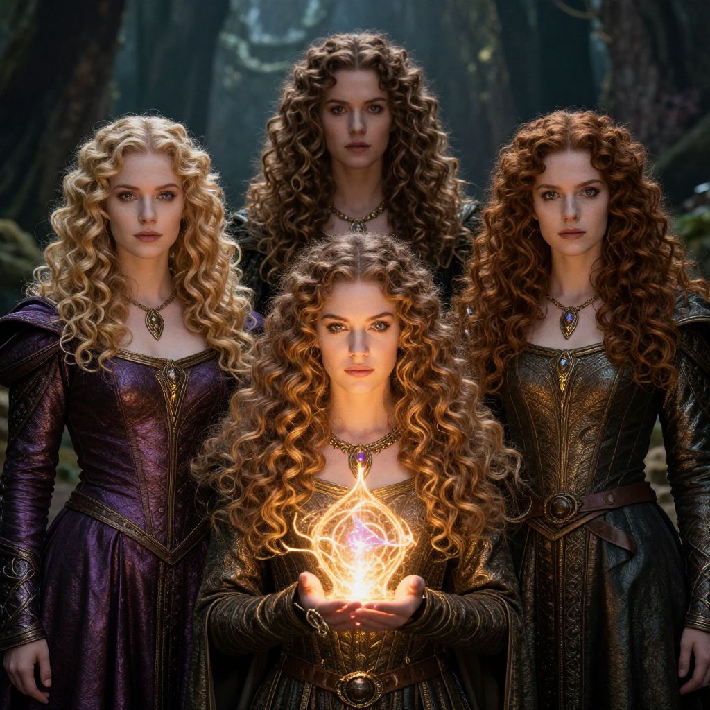 Photograph of a young woman with long brown hair standing with her back to a large ornate mirror, brightly lit from behind. She wears a black, knee-length skirt and black high heels, contrasting with the light-colored dresses of eight women standing in a semicircle around her, reflected in the mirror. The women have wavy hair and wear pastel-colored, sleeveless dresses with lace detailing. The room has a striped ceiling and marble floor, with soft, ambient lighting. The scene evokes a vintage, elegant atmosphere, with the women's reflections adding depth and symmetry to the composition.