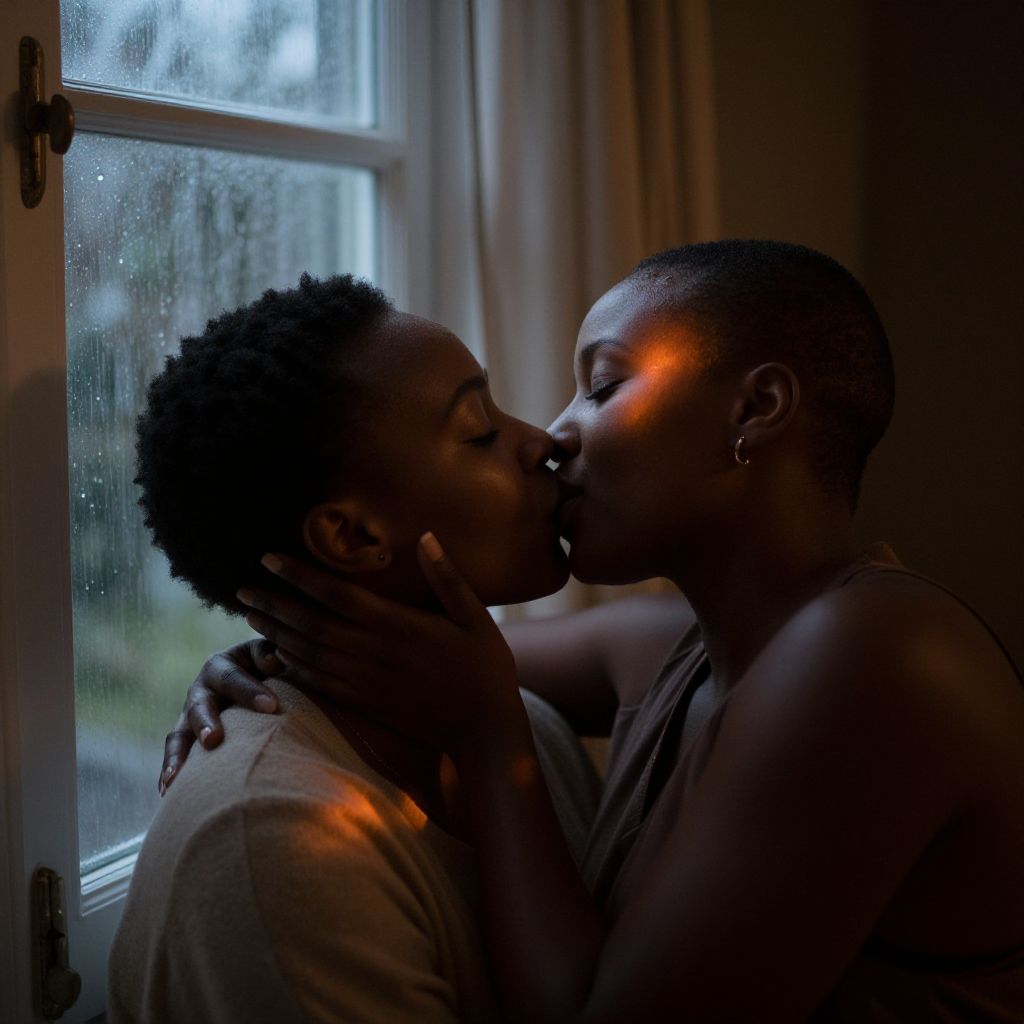 Black woman kissing warmly in a cozy indoor setting, near a window with rain droplets and soft curtains, moody and intimate atmosphere with warm light reflections, detailed textures on skin and clothing, emotional and heartfelt scene