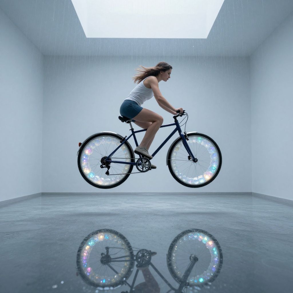 A woman pedals a bicycle with wheels composed of shimmering, translucent spheres, defying gravity as she glides seamlessly across the inverted surfaces of a rain-slicked, ethereal room.