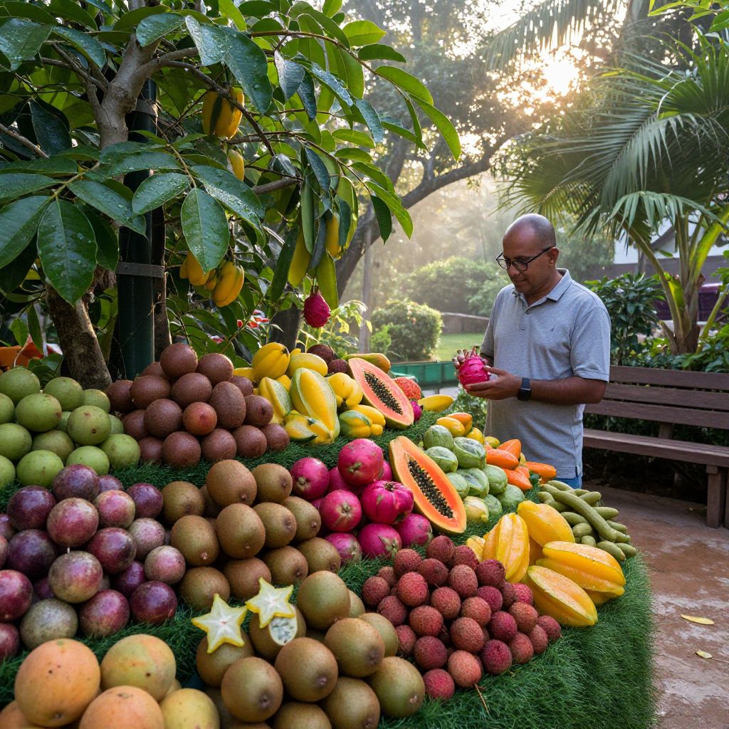 Photograph of a colorful fruit display in a lush tropical garden, with a mix of diverse fruits including passionfruit, kiwi, papaya, lychee, and starfruit growing naturally among green foliage. The scene is set in a sunny South Asian backyard during early morning, with dew on the leaves and soft golden light filtering through the canopy. A middle-aged man with a shaved head, glasses, and a calm expression is standing slightly behind a wooden bench, leaning in to examine a ripe dragon fruit with thoughtful concentration.