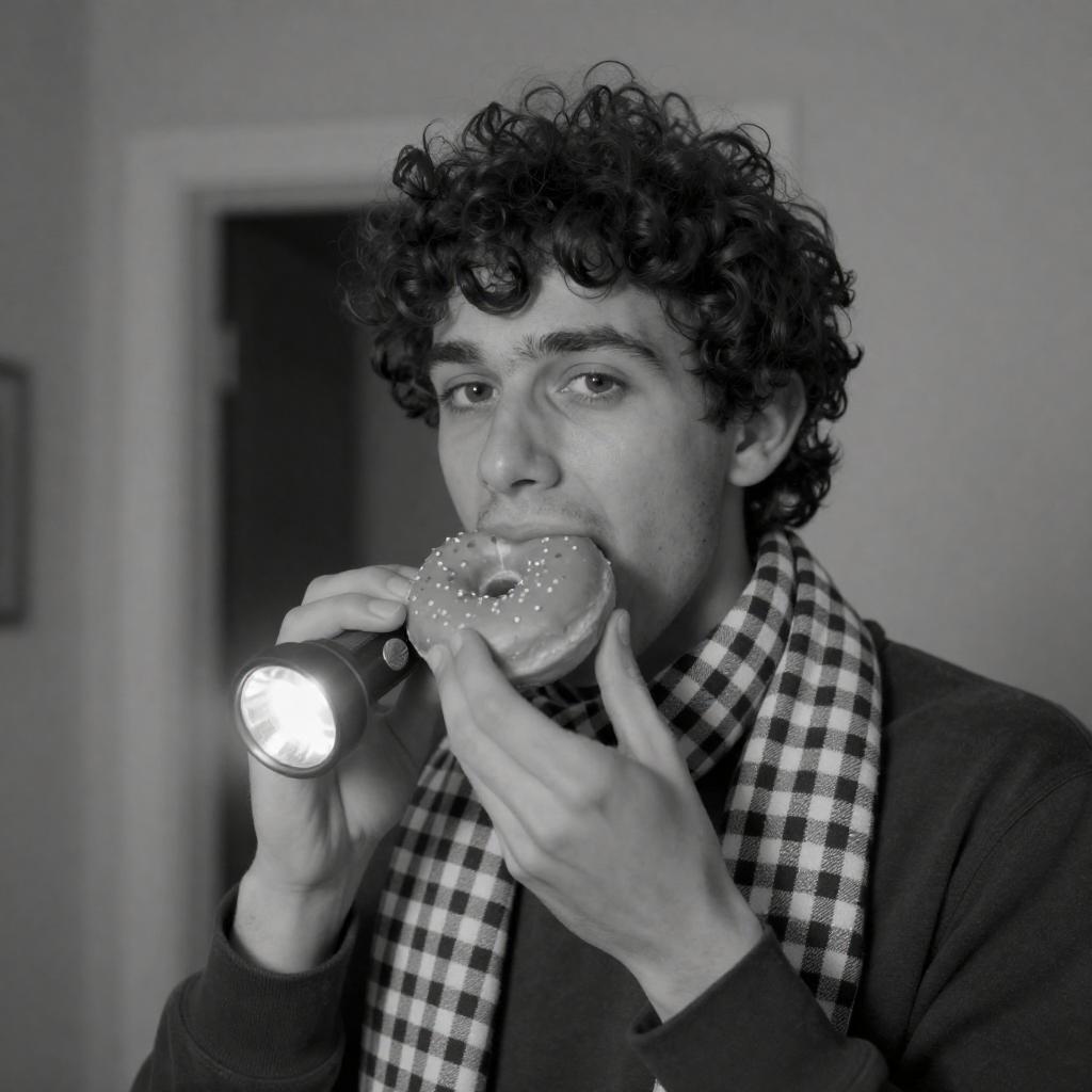 Black and white photograph of a young man with curly hair, holding a flashlight to his face and eating a doughnut. He wears a checkered scarf and a dark shirt. His hands grip the doughnut and flashlight. The background shows a doorway and plain walls. His expression is neutral.