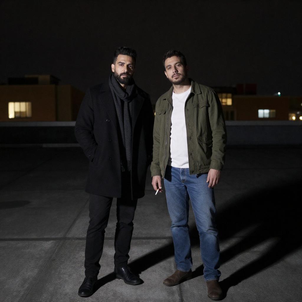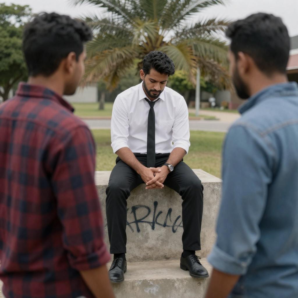 Photograph of five men in a dimly lit hallway. Four men in dark jackets and brown hoodies stand in a line on the left, facing a fifth man in a white shirt and brown jacket standing in front of a white door. The man in the white shirt looks down, while the others gaze at him. The background includes a gray wall and an air vent above the door.