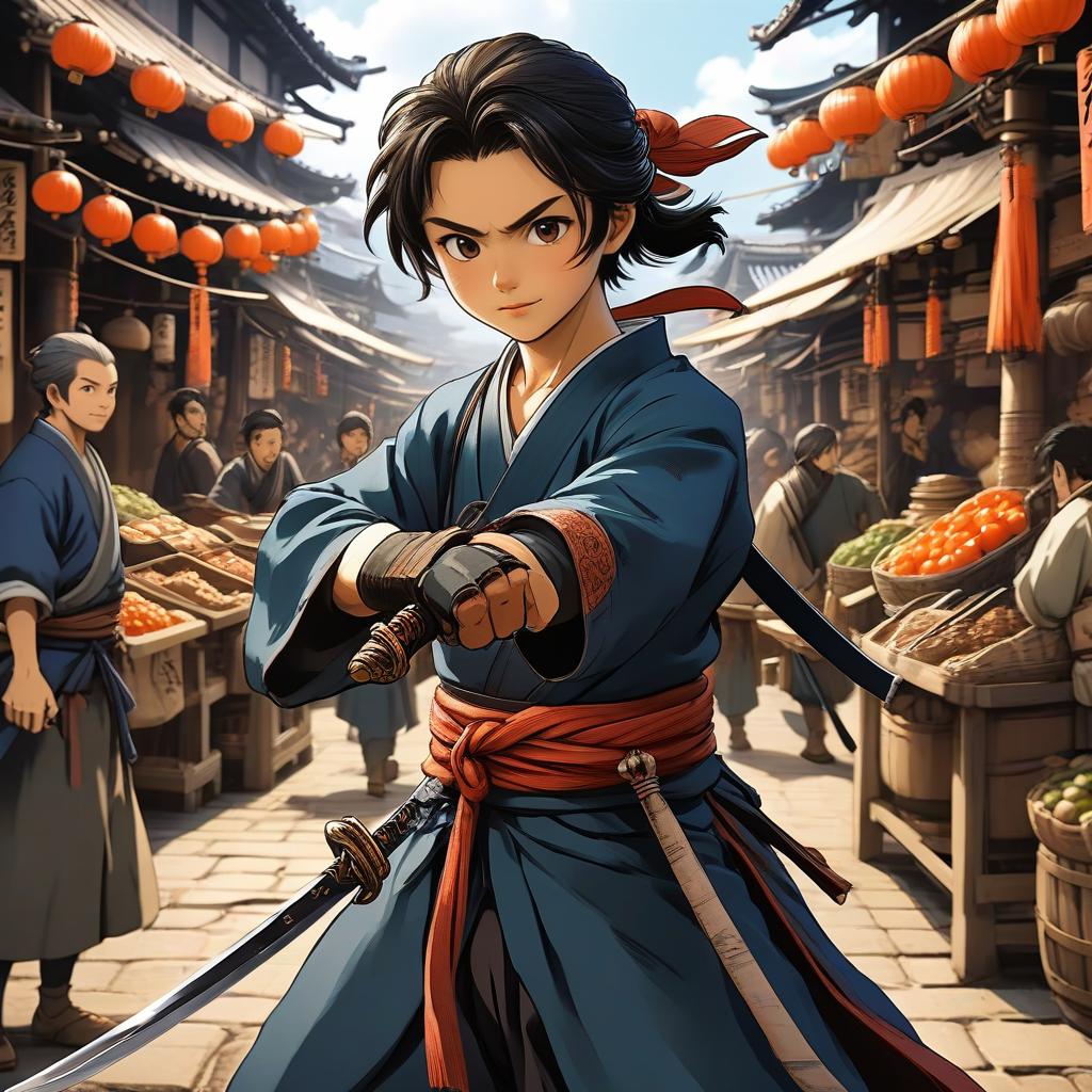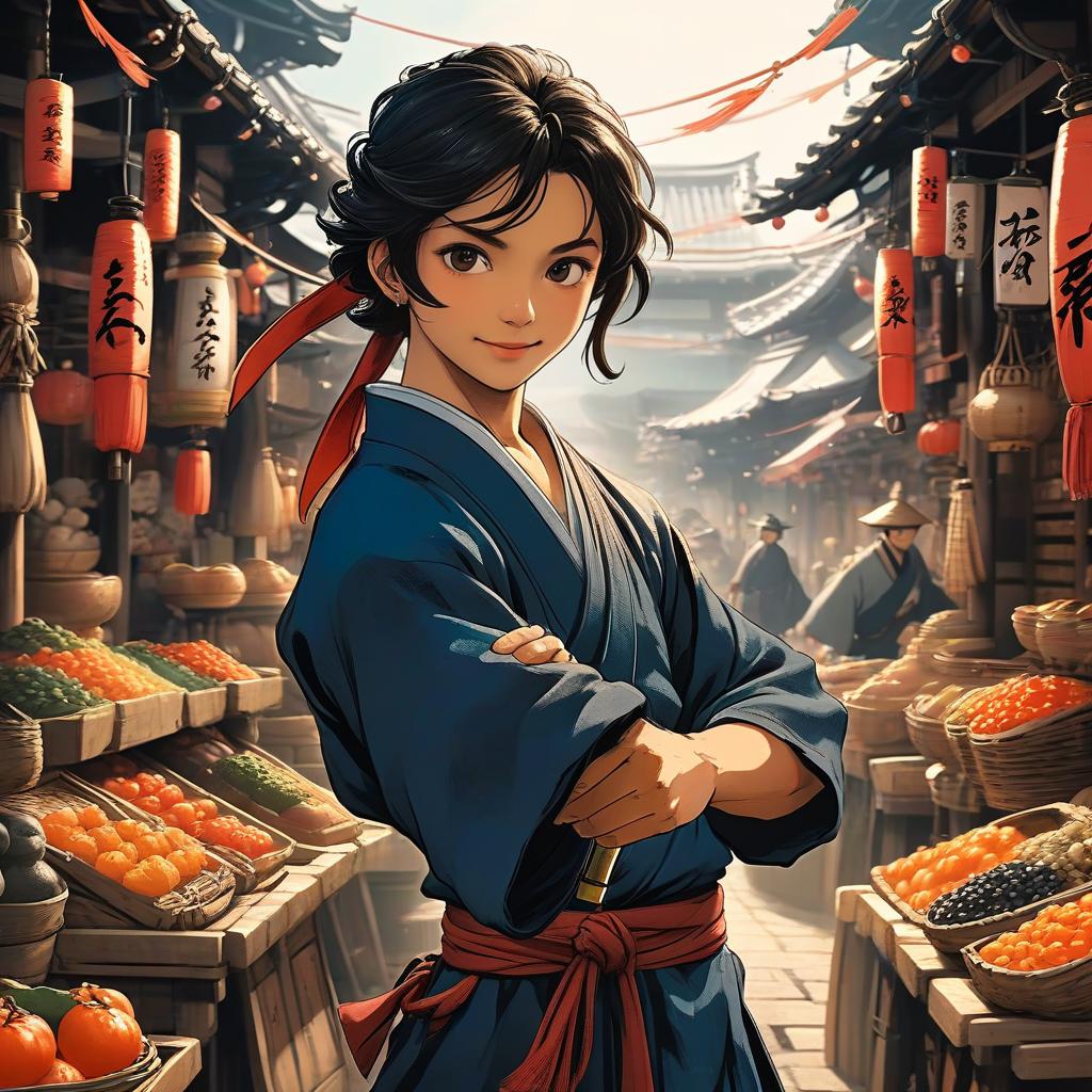Anime-style illustration of a cunning young thief with quick eyes and a mischievous smile, dressed in traditional dark blue and red clothing, wielding a curved katana sword. The character stands confidently in a bustling traditional Asian marketplace filled with baskets of fresh produce and vibrant orange lanterns hanging overhead. The scene is rich in cultural detail, capturing the dramatic and classic anime style reminiscent of Sanpei Shirato.